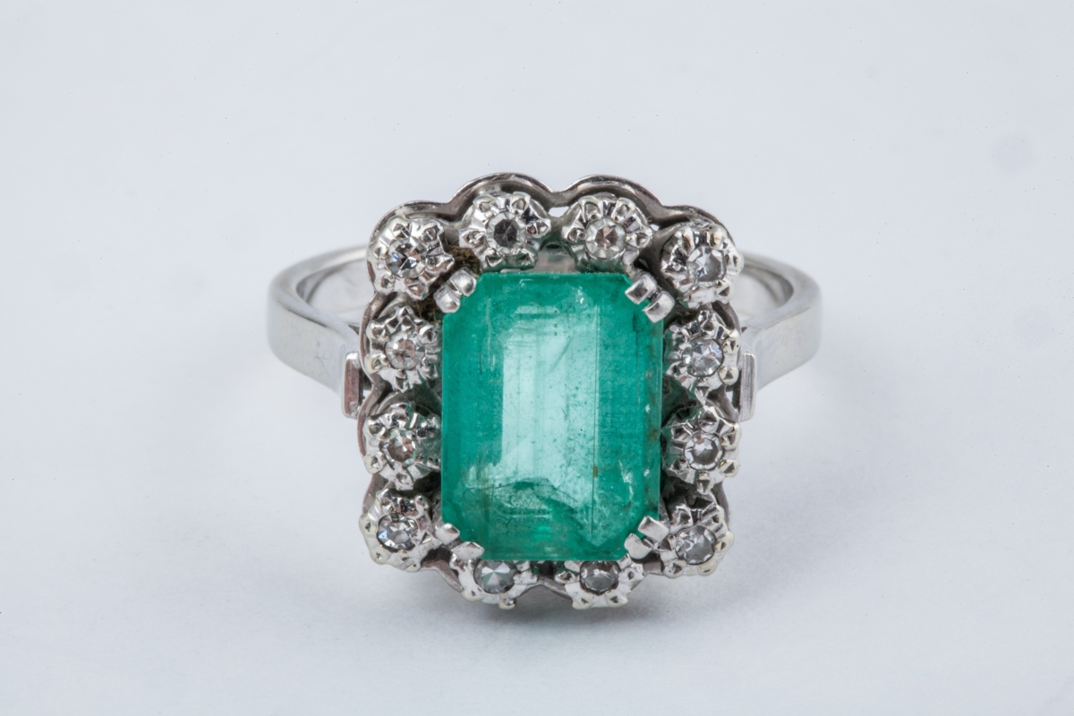 BAGUE ornée d'une émeraude rectangulaire dans un entourage de diamants taillés en huit-huit, la monture en or et platine.