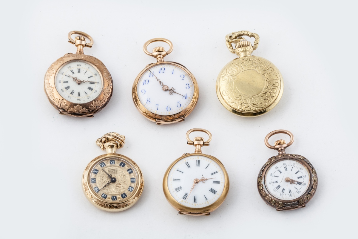 Lot de CINQ MONTRES de col en or jaune gravé et une montre de col en métal.Poids brut: 70 g