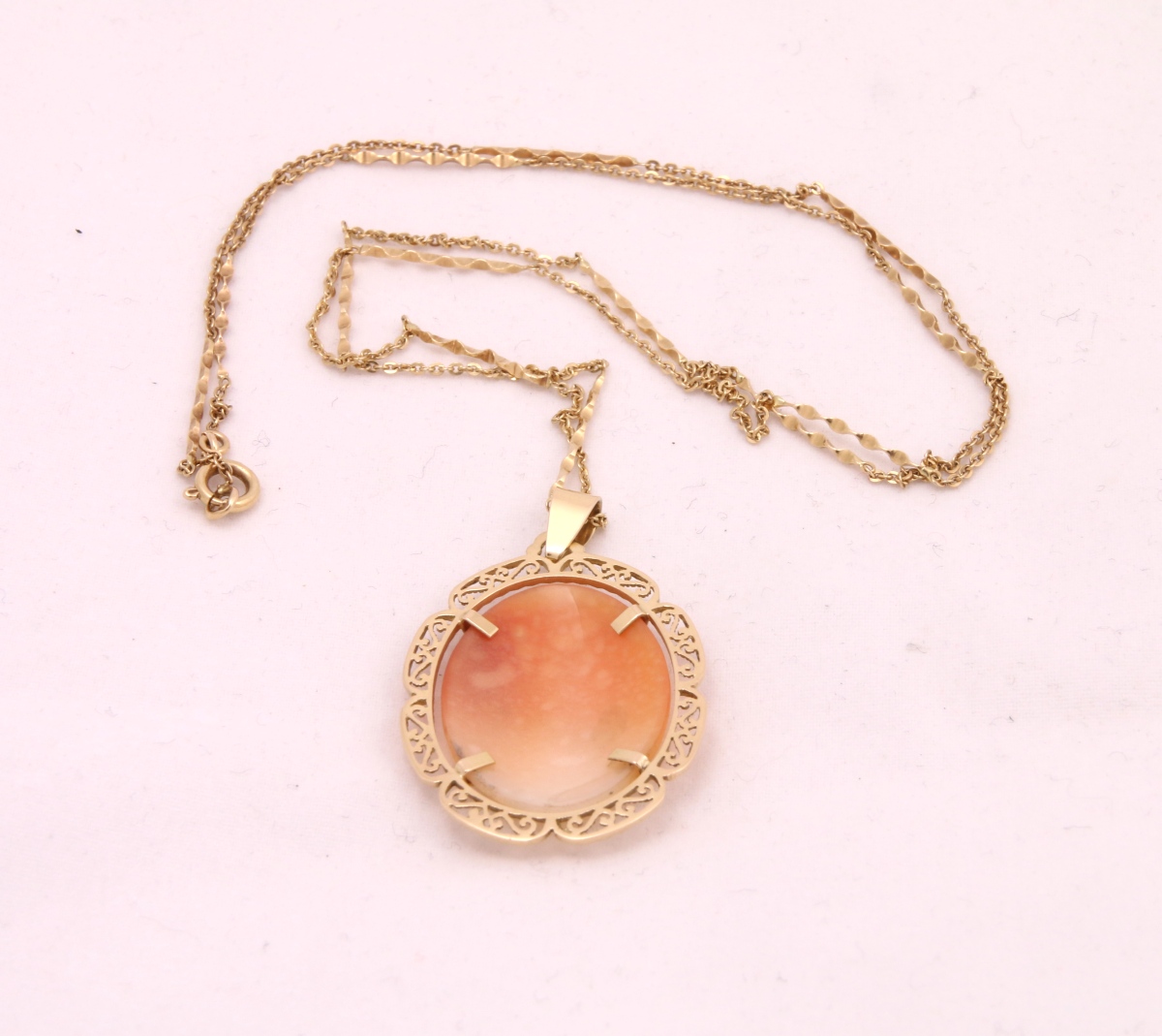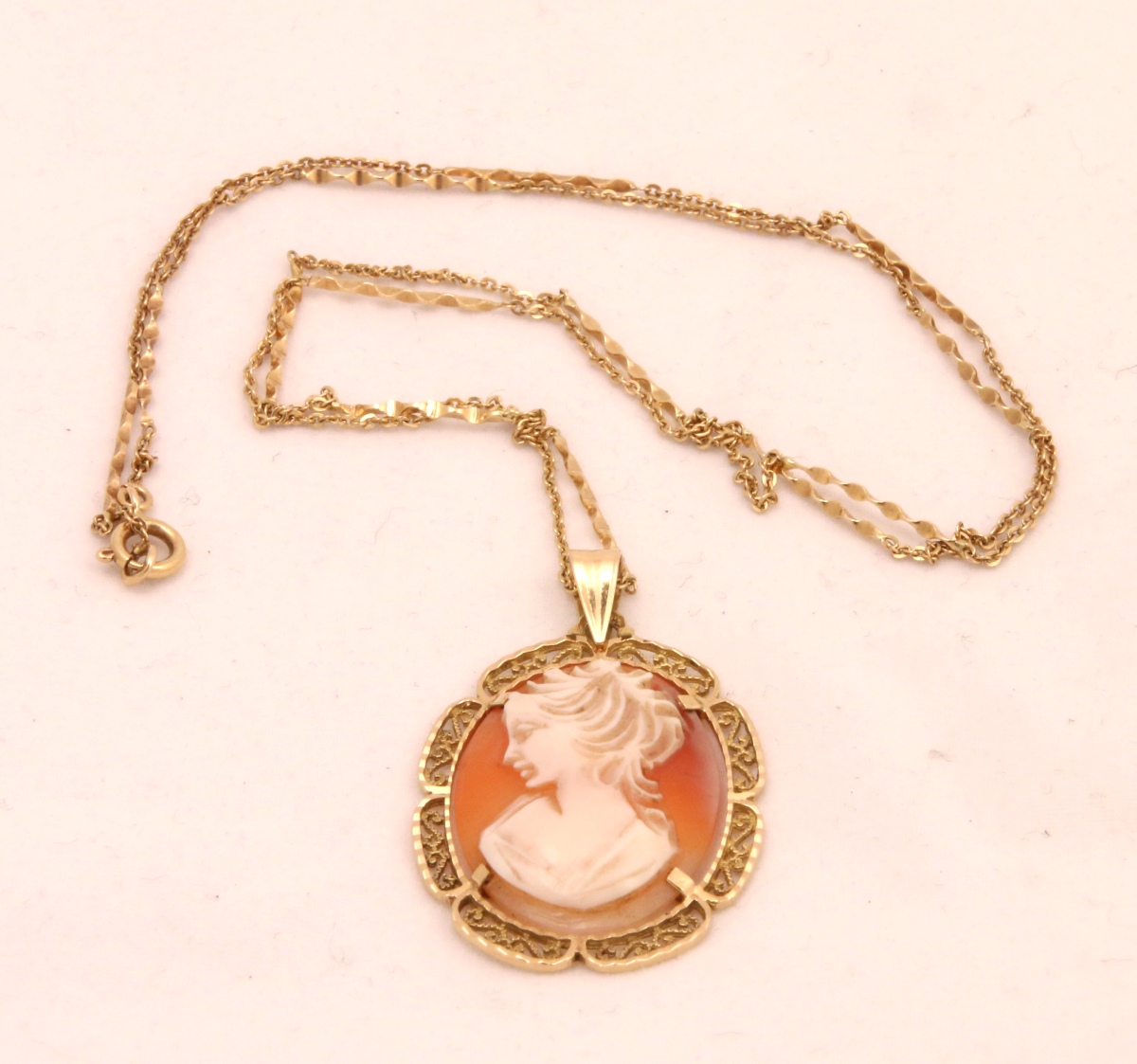 CHAINE or retenant un MEDAILLON en or enchassant un camée jeune femme de profil.