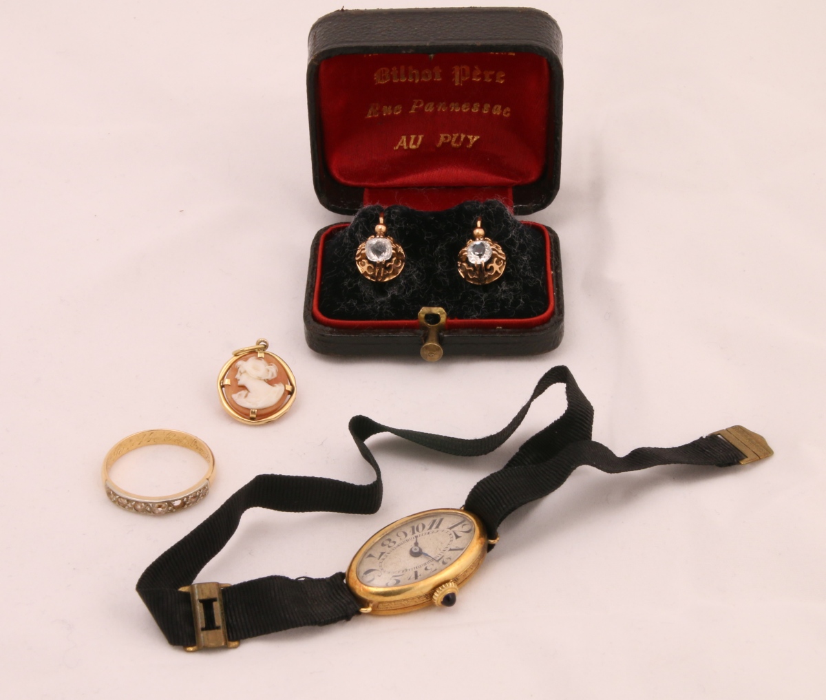- MONTRE BRACELET de dame en or jaune de forme ovale, le cadran gradué pour les minutes, les heures en chiffres arabes, remontoir à 3 heures orné d'un cabochon en pierre bleue. Bracelet de ruban noir. Poids brut: 10,6 g.