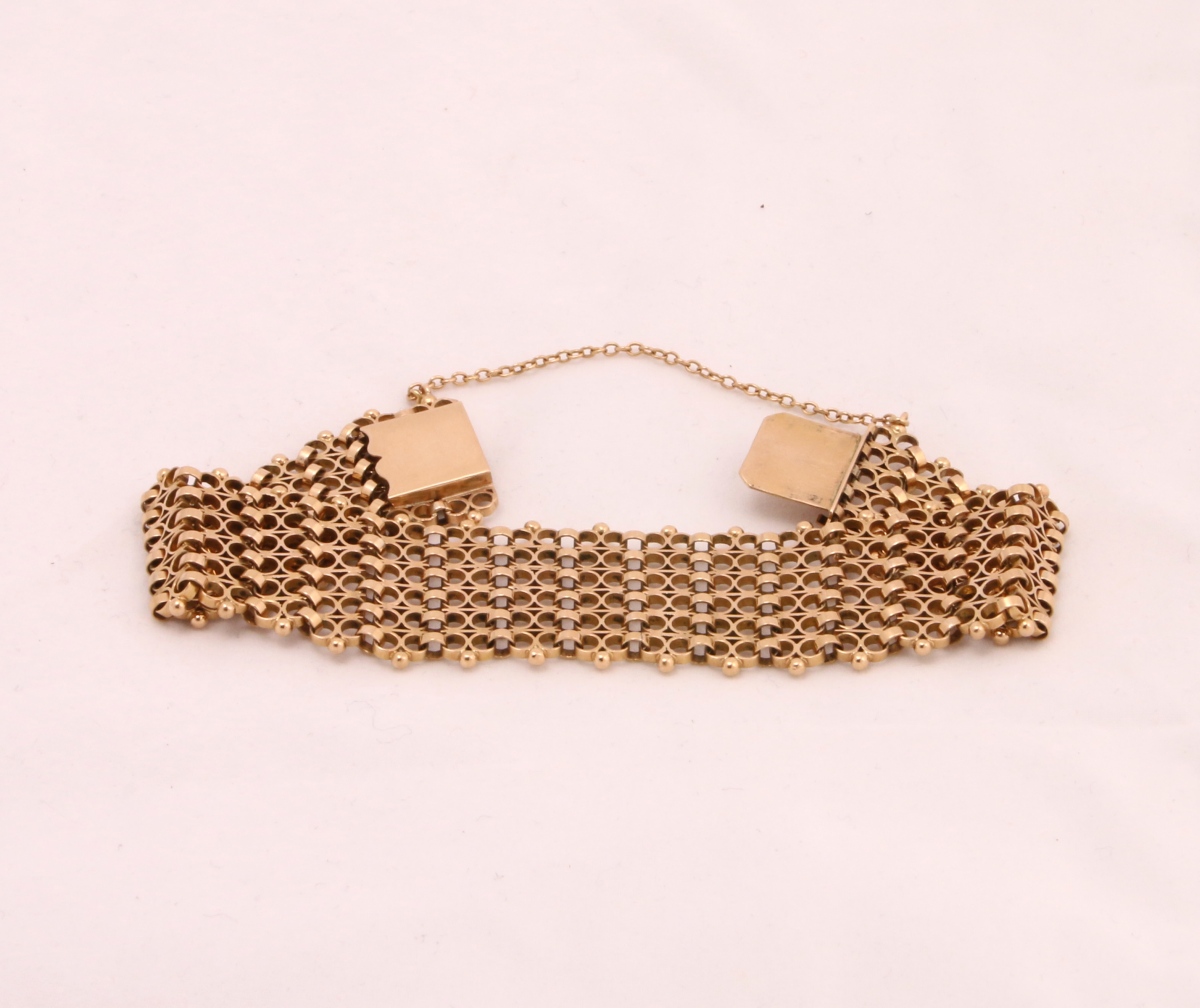 Large BRACELET à mailles souples en or jaune. Chaînette de sécurité pour le fermoir.