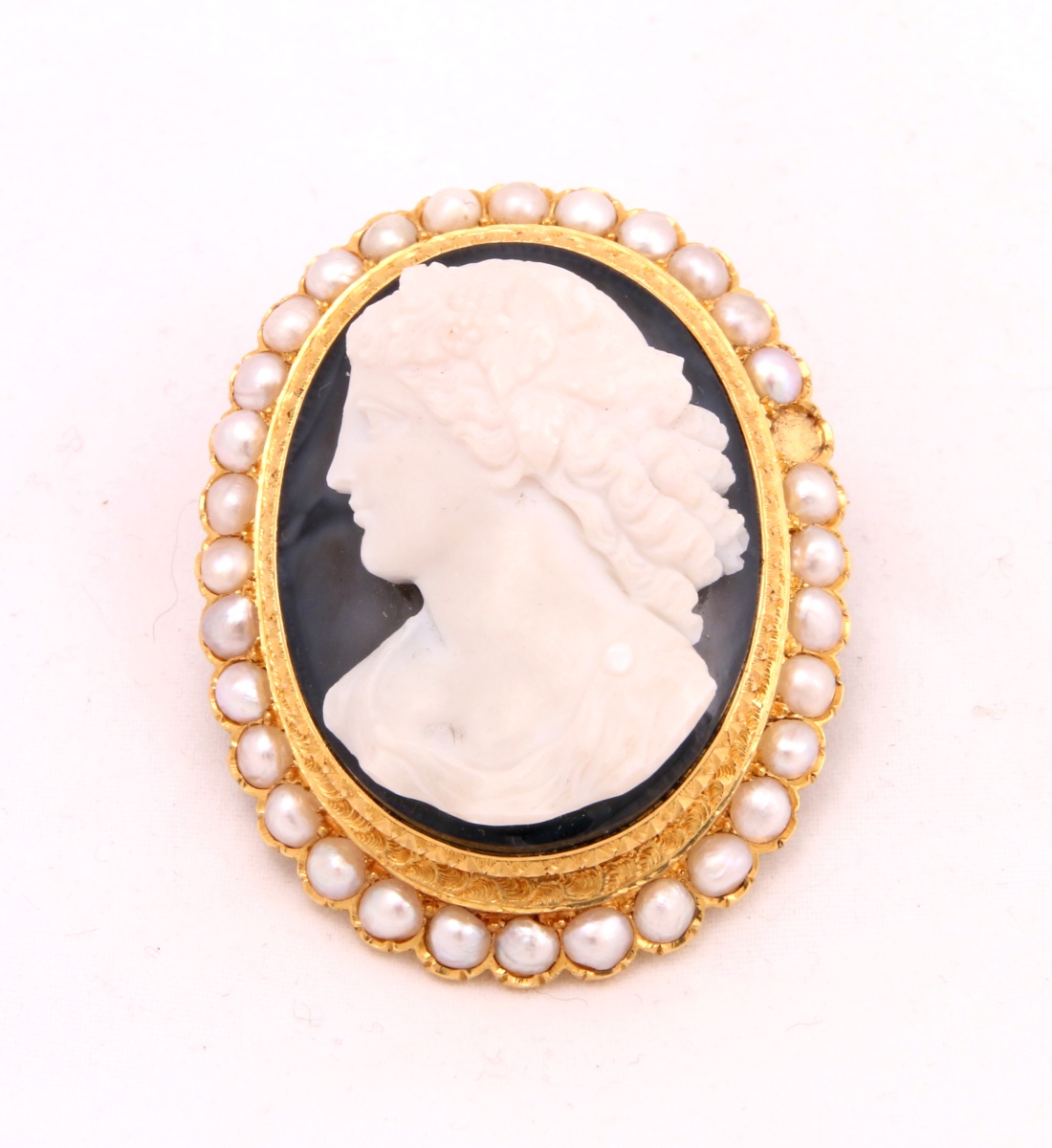 CAMÉE agate de forme ovale figurant, en blanc sur fond bleu-gris, une femme en buste de profil. Se cheveux bouclés tombant sur les épaules sont ornés de pampres de vigne. Monture en or jaune ornée de guillochis et sertie en bordure de demi-perles (manque une).