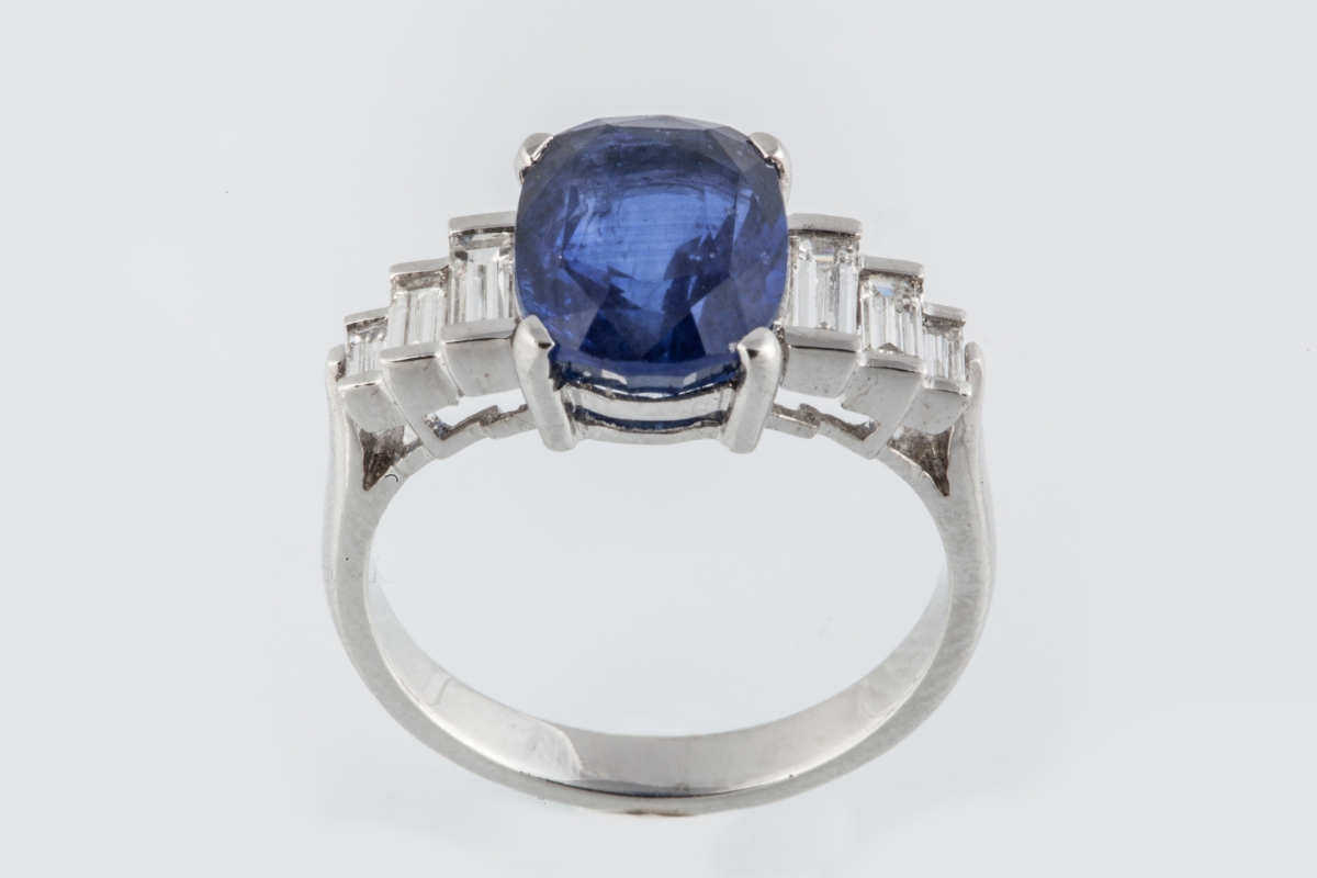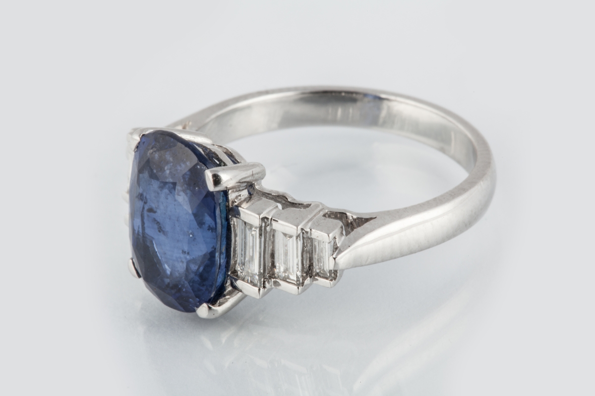 BAGUE en or blanc sertie d'un SAPHIR taille ovale de 4,55 carats épaulé de 6 diamants blancs taille baguette de 0,40 carat environ.