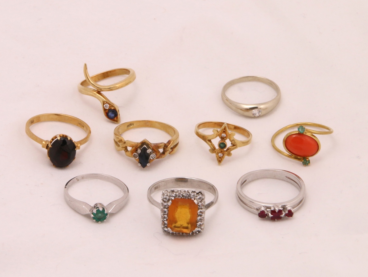 9 BAGUES en or blanc ou jaune 18k serties de pierres précieuses ou semi-précieuses.