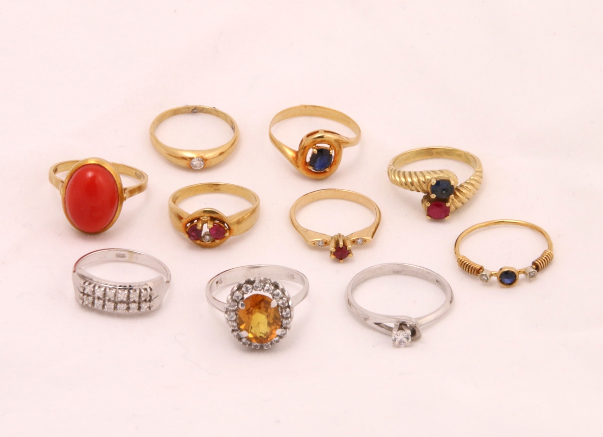 10 BAGUES en or blanc ou jaune 18k serties de pierres précieuses ou semi-précieuses.