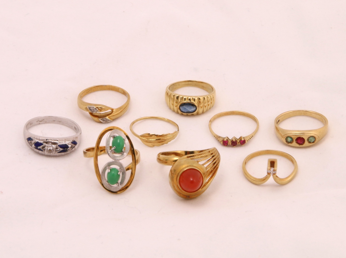 9 BAGUES en or blanc ou jaune 18k serties de pierres précieuses ou semi-précieuses.