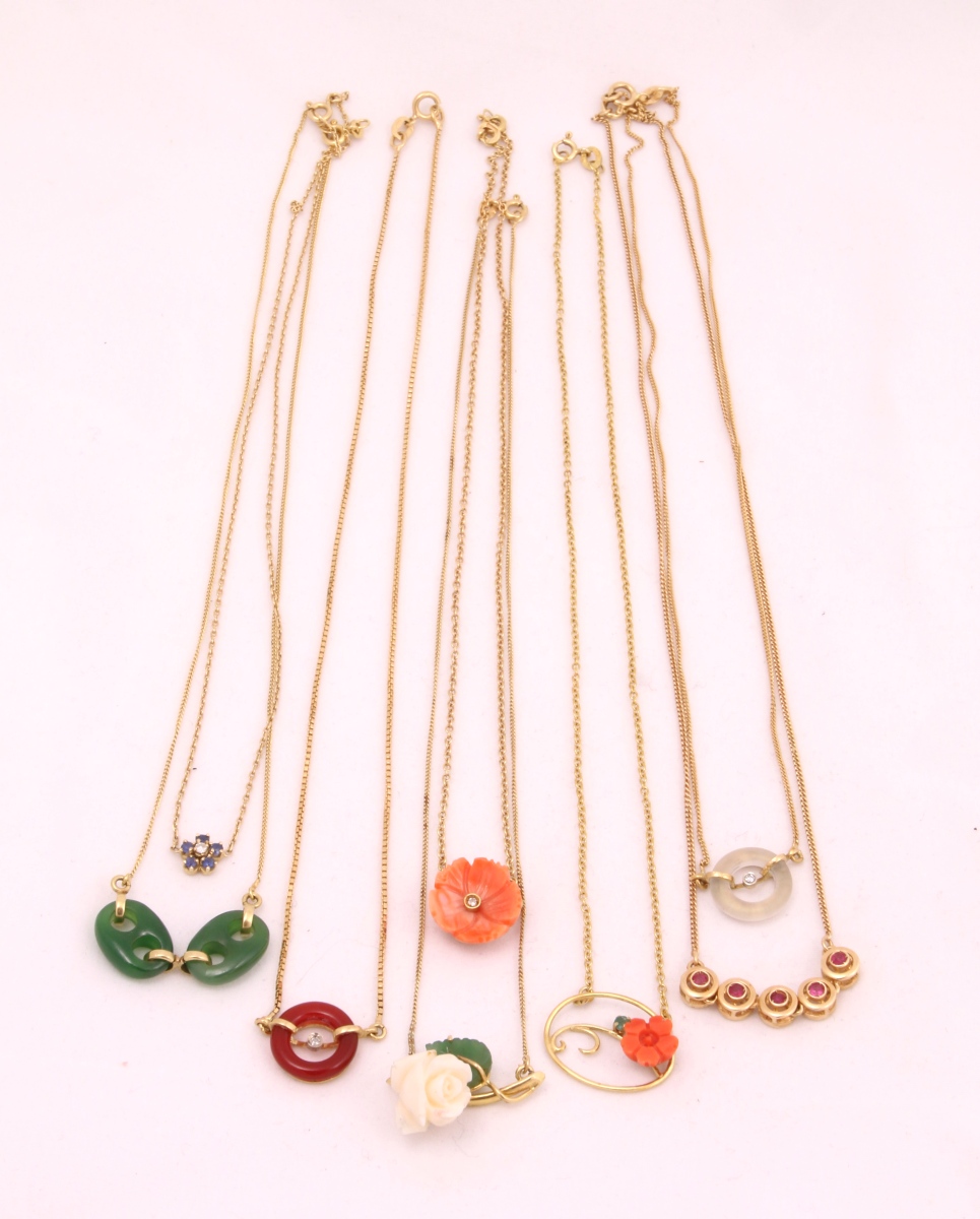 8 COLLIERS, mailles diverses, en or jaune 18k, centrés d'un ornement serti de pierres précieuses ou semi-précieuses.