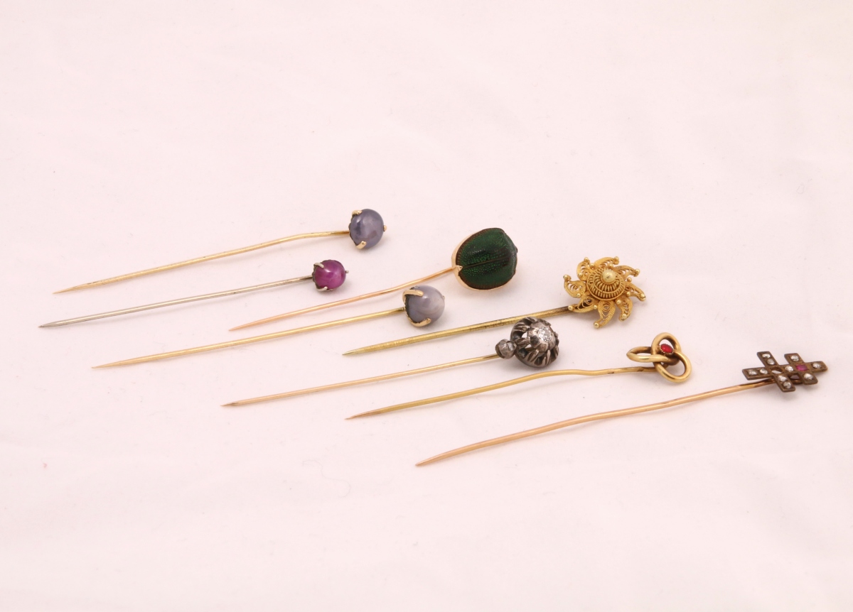 8 ÉPINGLES à CRAVATE en or. Une sertie d'un petit diamant taille ancienne, trois serties d'un cabochon de pierre fine, une ornée d'une carapace de scarabée, une en croix de Lorraine agrémenée de pierres, une figurant un soleil en filigrane et la dernière à motif trilobé centré d'u ne pierre de couleur.