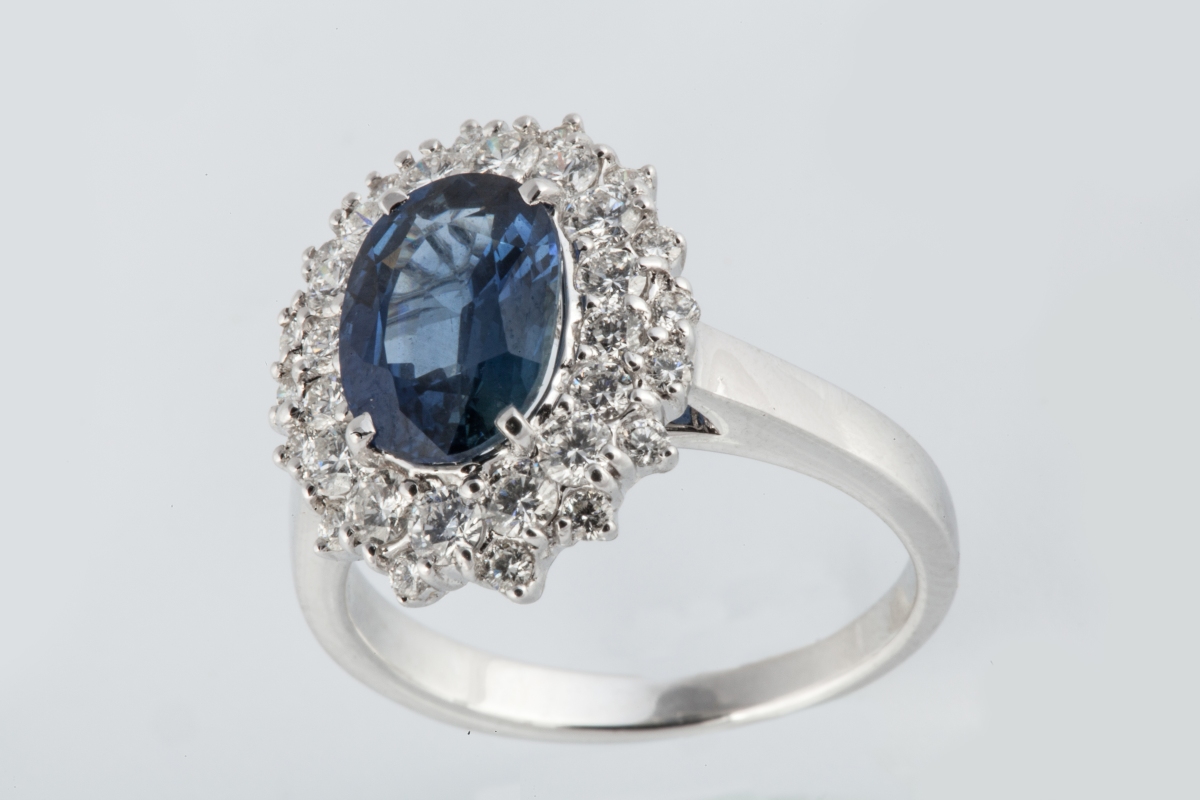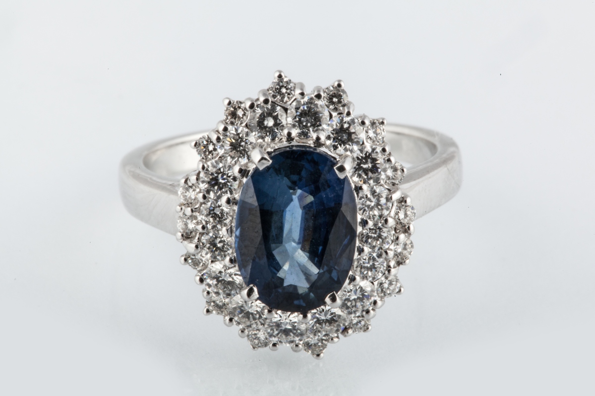 BAGUE de forme ovale en or blanc ornée d'un SAPHIR taille ovale de 2,40 carats environ dans un double entourage de 32 diamants blancs taille moderne de 0,90 carat.