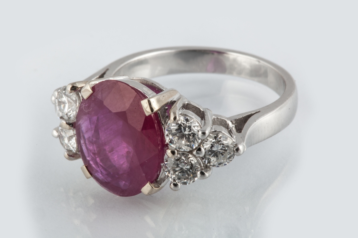 BAGUE en or blanc ornée d'un RUBIS (probablement Birman) taille ovale de 3 carats épaulé de 6 diamants blancs taille moderne de 0,90 carat environ.