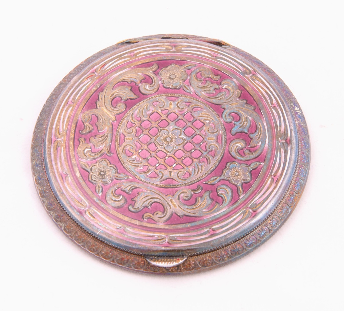 POUDRIER argent, de forme circulaire, doublement orné d'entrelacs et fleurettes émaillés sur fond mauve-rose. Travail anglais.