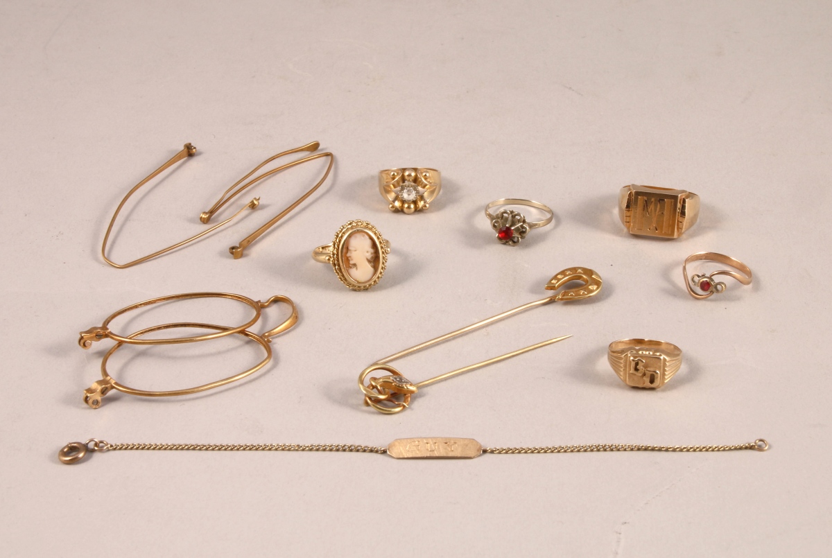 Réunion de petits bijoux or: lorgnon, 6 bagues, 2 épingles de cravatte, 1 gourmette Bébé.