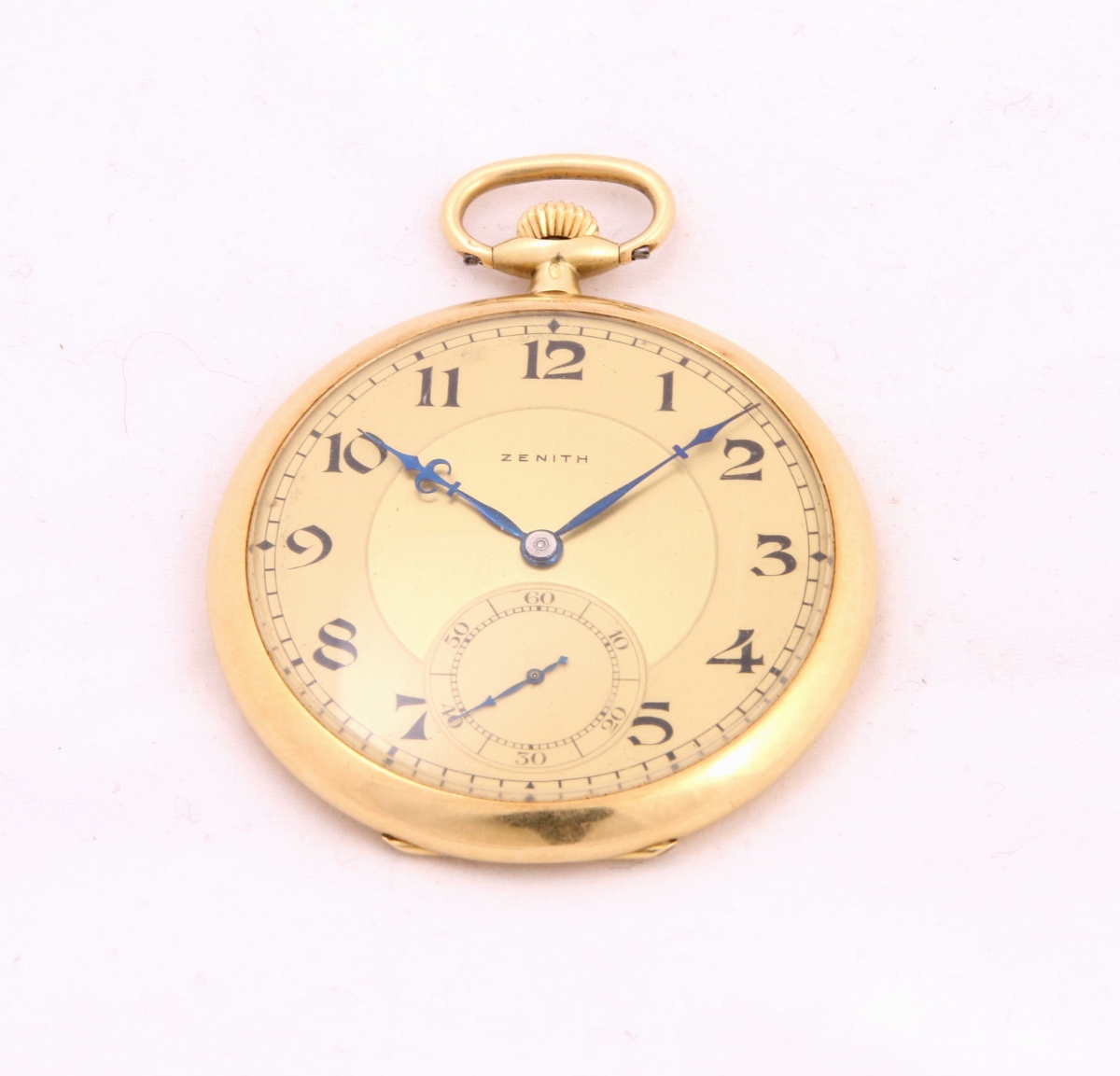 ZENITH. MONTRE DE GOUSSET extra plate à remontoir au pendant en or. Double cadran, heures et secondes, en métal doré amati. Aiguilles en acier bleuï. Numérotée 12788.