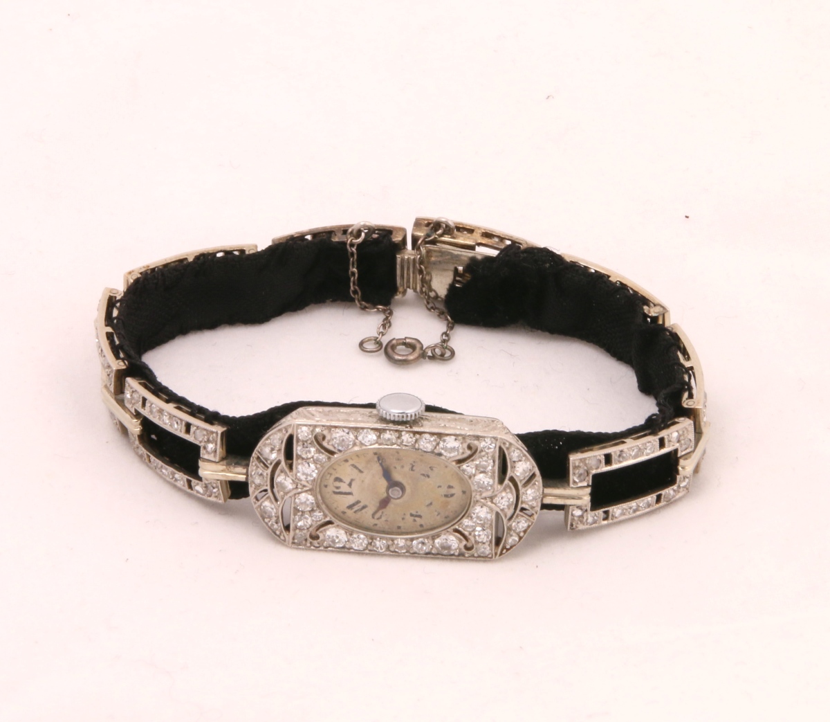 MONTRE-BRACELET de coktail pour dame en platine. Le boîtier de forme oblongue agrémenté de palmettes styliséees et le bracelet à mailles rectangulaires entièrement pavés de petits diamants. Les flancs du boîtier gravés de deux félins affrontés.