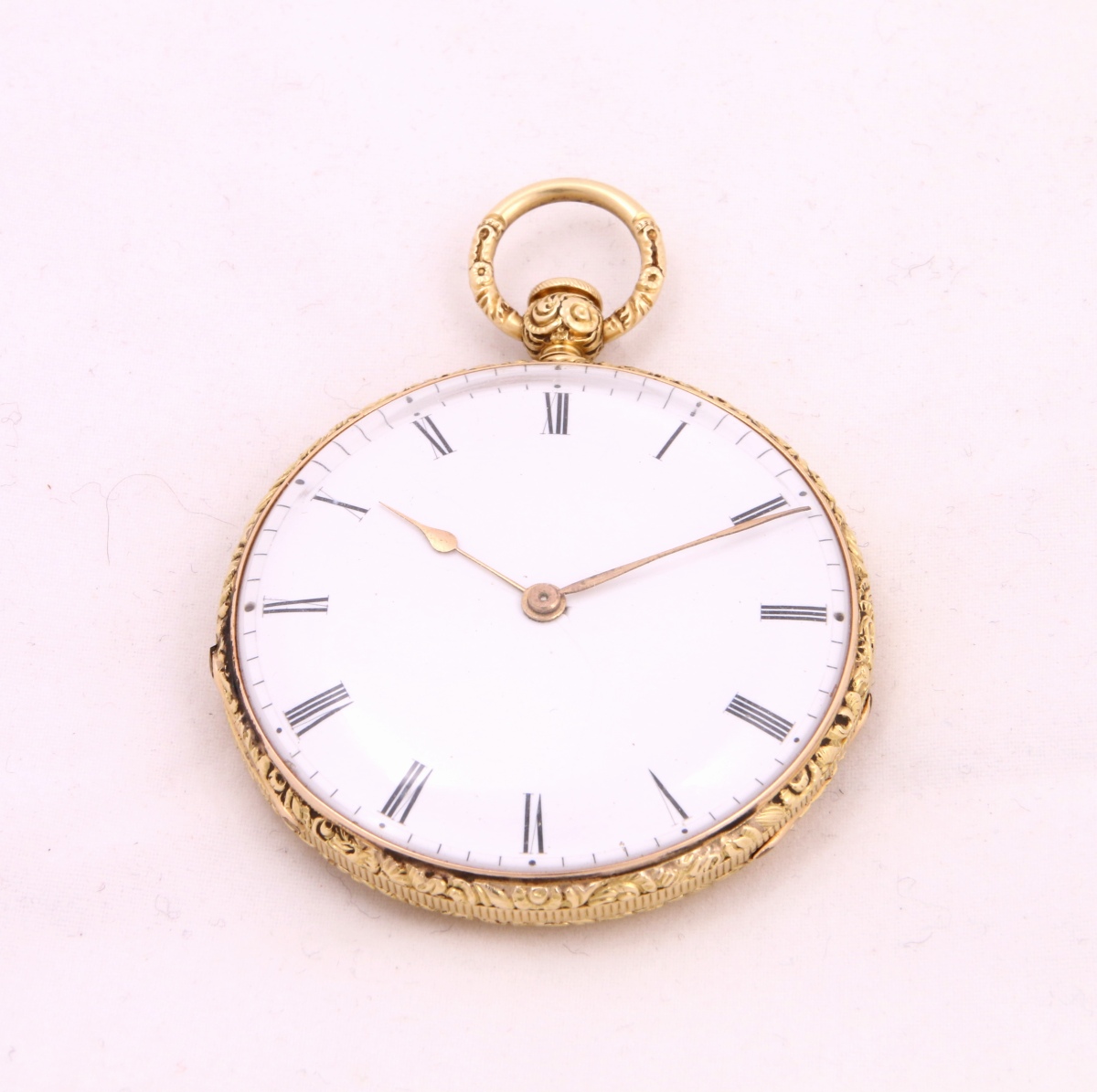MONTRE de GOUSSET à sonnerie, à clef, en or jaune. Le dos centré d'un cartouche gravé d'un portrait en buste du général Lazare Hoche dans un riche encadrement de rinceaux. Cache-poussière marqué "Echappement à cylindre / Huit / trous en rubis". Cadran émaillé blanc indiquant les heures en chiffres romains.
