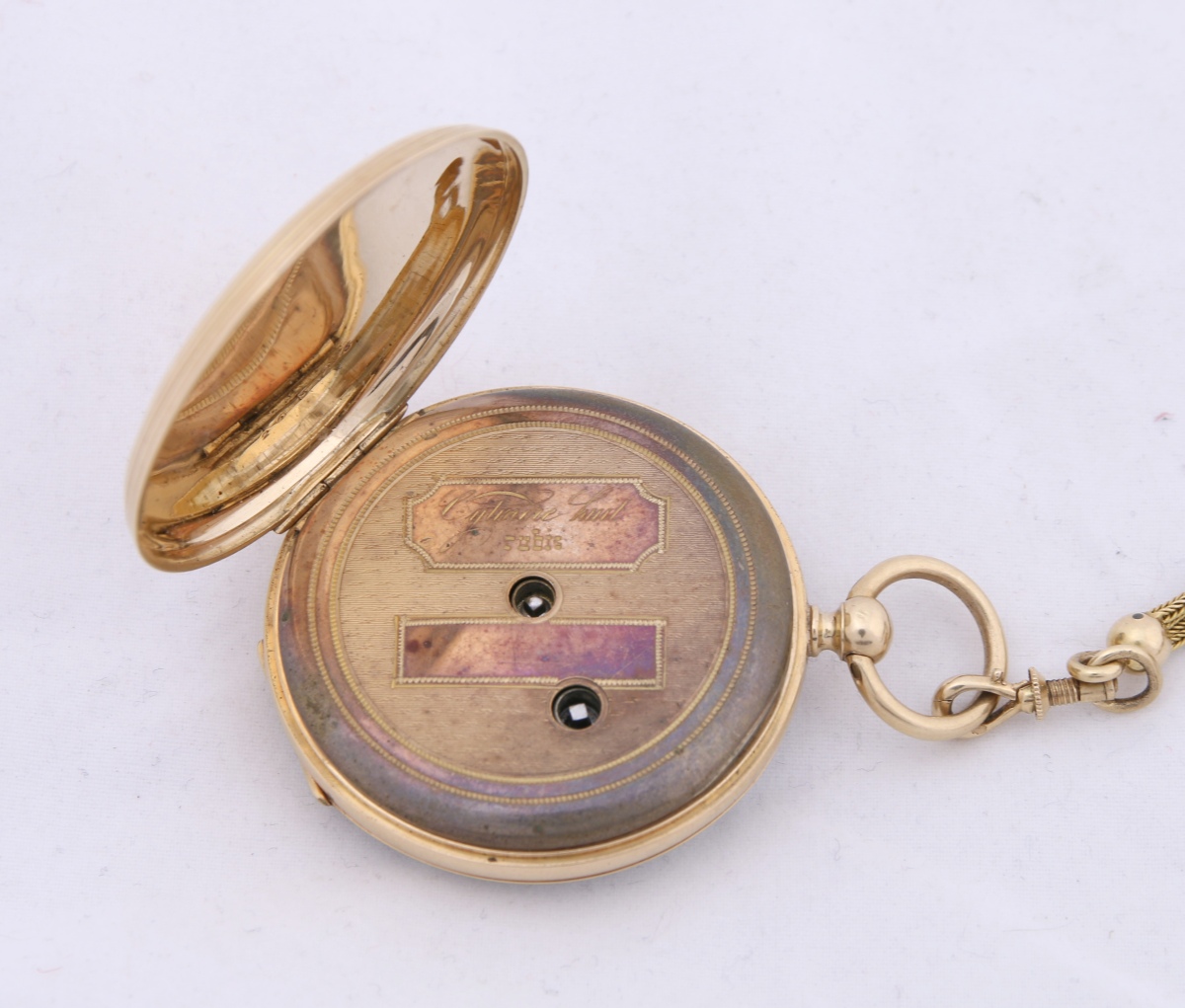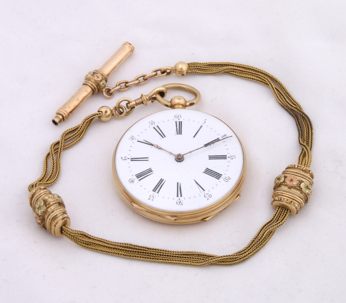 MONTRE d'homme en or, remontoir à clé. Et sa châtelaine à deux coulissants en or de deux tons. Fin XIXe.