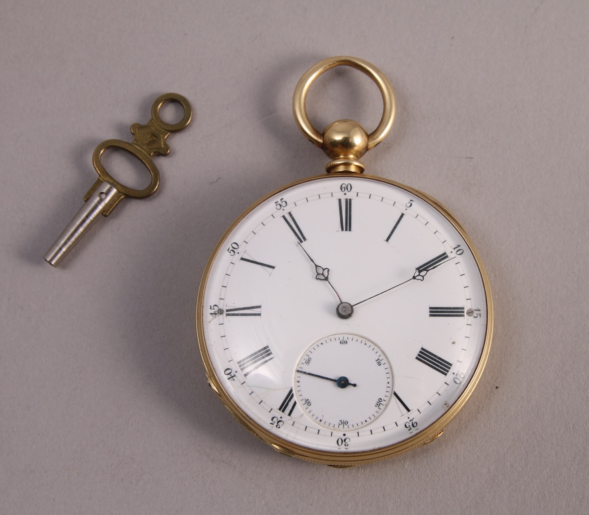 MONTRE DE GOUSSET à clef en or jaune. Double cadran émaillé blanc indiquant les heures en chiffres romains, les 5 minutes et les dix secondes en chiffres arabes. Dos guilloché. Cache-poussière marqué "Berguer & fils / Grand Quai N'30 / Genève / Echappement à cylindre / huit trous rubis / N''8119".