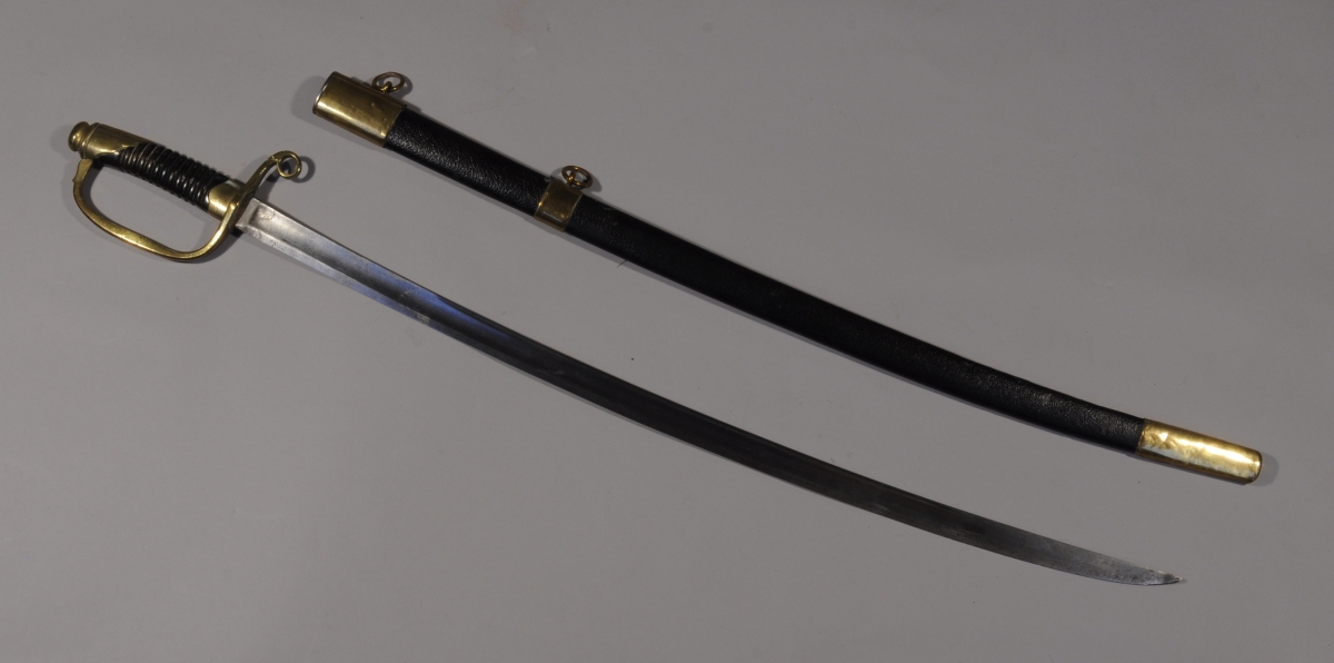 RUSSIE. SABRE DE CAVALERIE LÉGÈRE. Poignée en corne. Monture en laiton, garde à une branche. Lame courbe à dos plat et pans creux, poinçonnée au talon. Fourreau postérieur à deux garnitures en laiton.