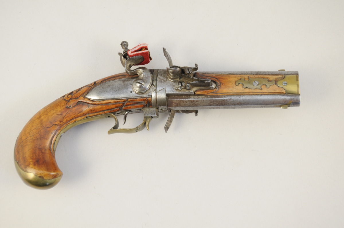 AUTRICHE ou ALLEMAGNE. PISTOLET À SILEX à deux canons surperposés tournants (raccourcis), un seul chien.