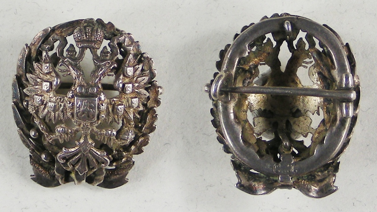Russie - INSIGNE de l'Académie d'état-major Nicolas, réduction de boutonnière en argent, élégante fabrication en plusieurs parties, la couronne de feuillage en haut-relief, fixation par épingle basculante, gravé au revers des initiales "C.X.", sans signature de fabricant.