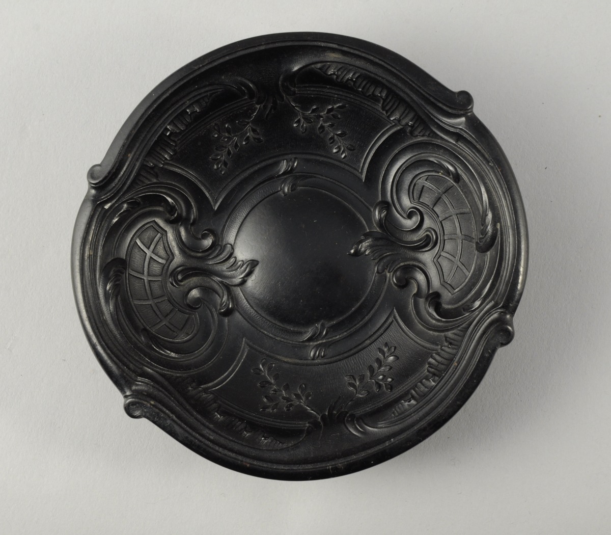 ENSEMBLE comprenant trois COUPES, une oblongue et deux circulaires, en gomme laquée moulée. Décor floral de style Art Nouveau, pour l'une et d'agrafes et rinceaux feuillagés de style Louis XV, pour les deux autres.
