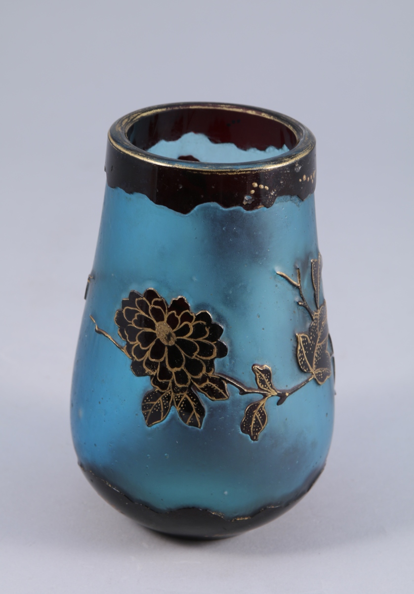 HARRACH. VASE tronconique à panse basse renflée en verre bicouche, rouge et bleu, gravé à la roue d'un rameau fleuri. Rehauts or.