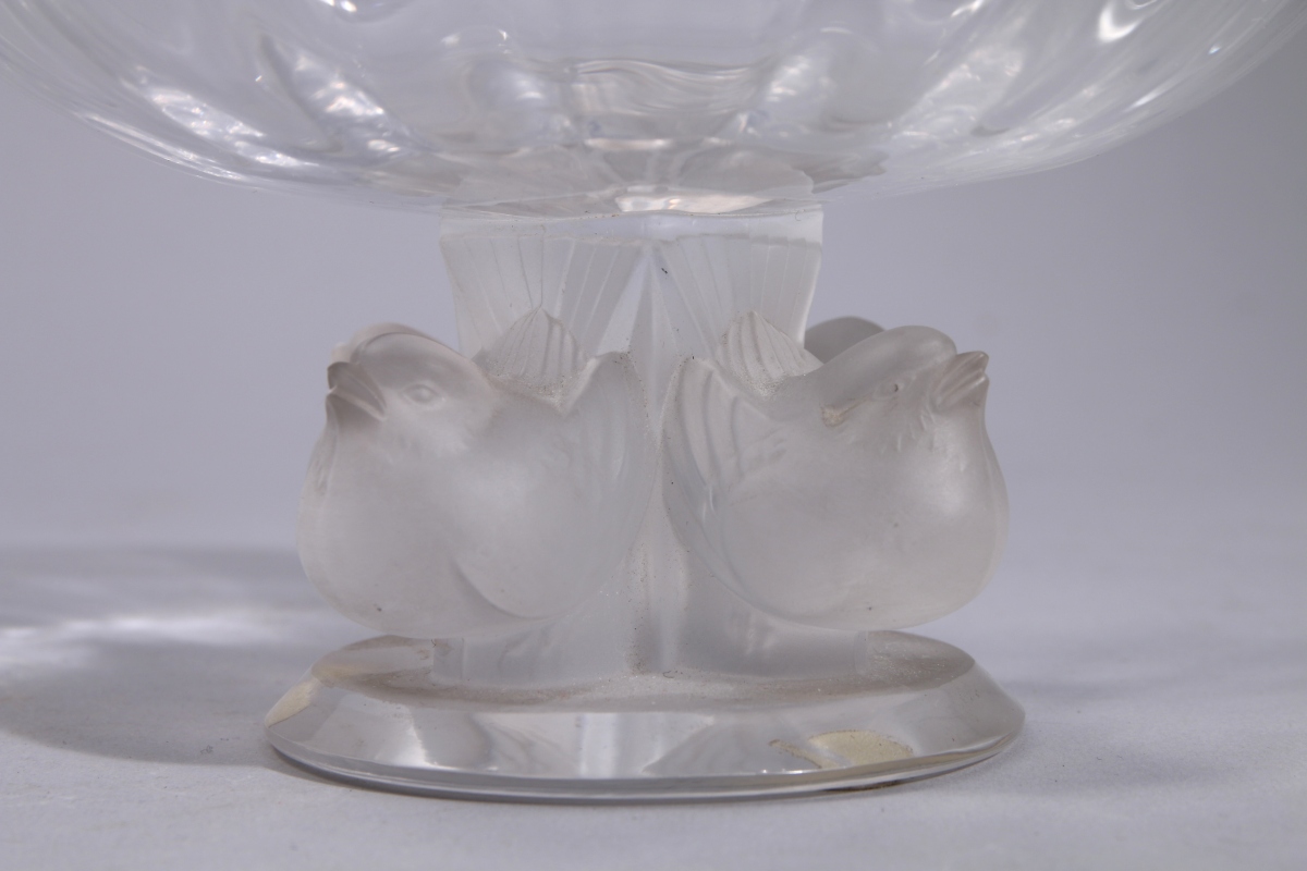 LALIQUE. Petite COUPE "NOGENT" de forme circulaire soutenue par quatre pinsons en verre moulé-pressé.