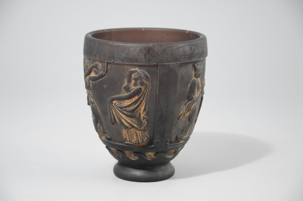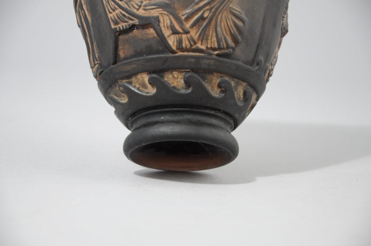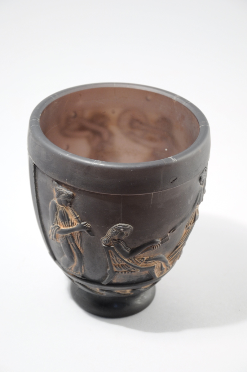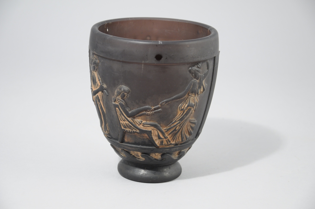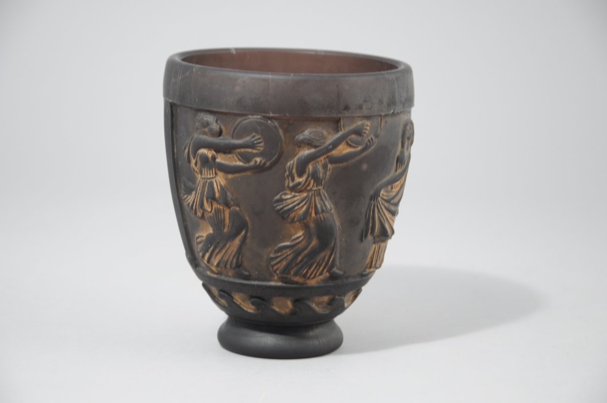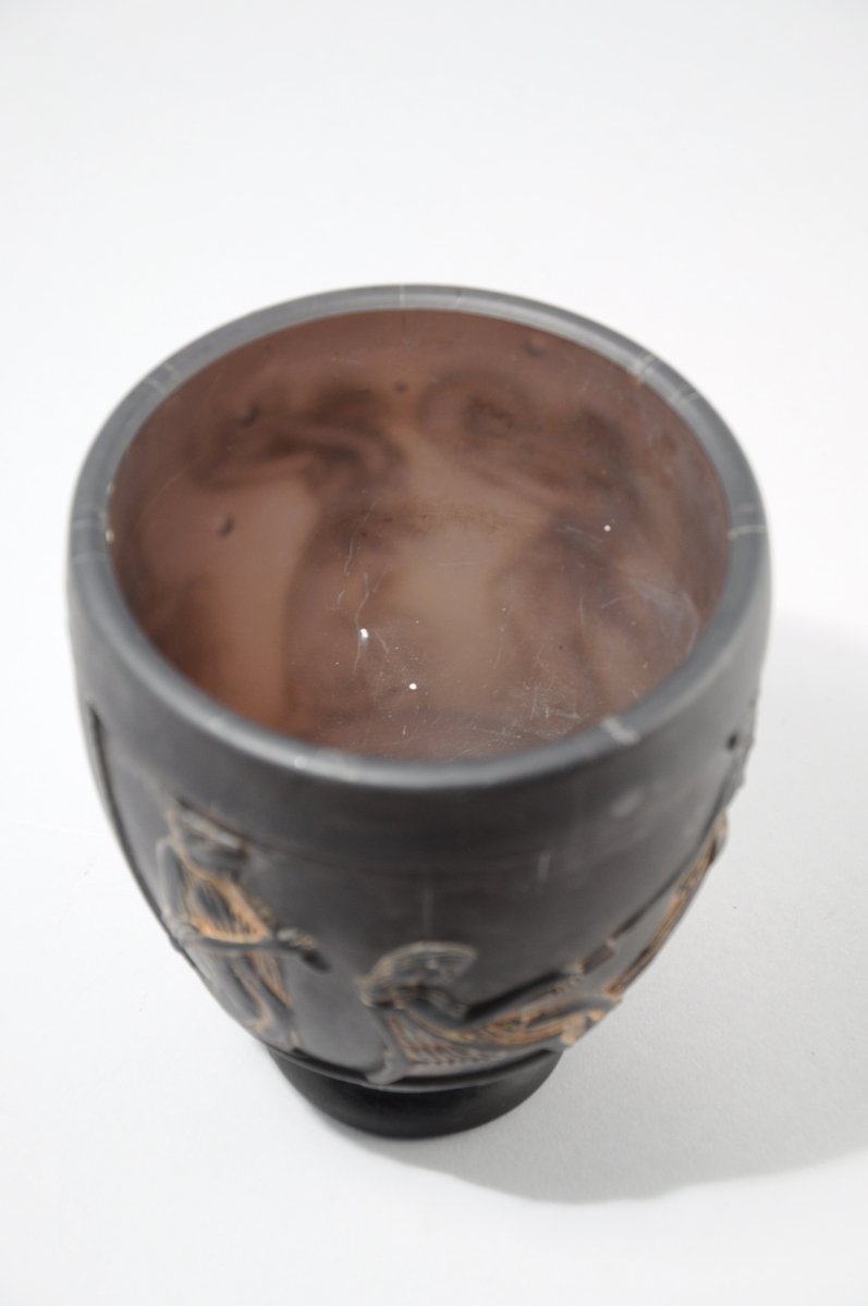 VASE ovoïde sur talon en verre violacé à décor moulé de danseuses à l'Antique. Une frise de postes en partie inférieure. Signé.