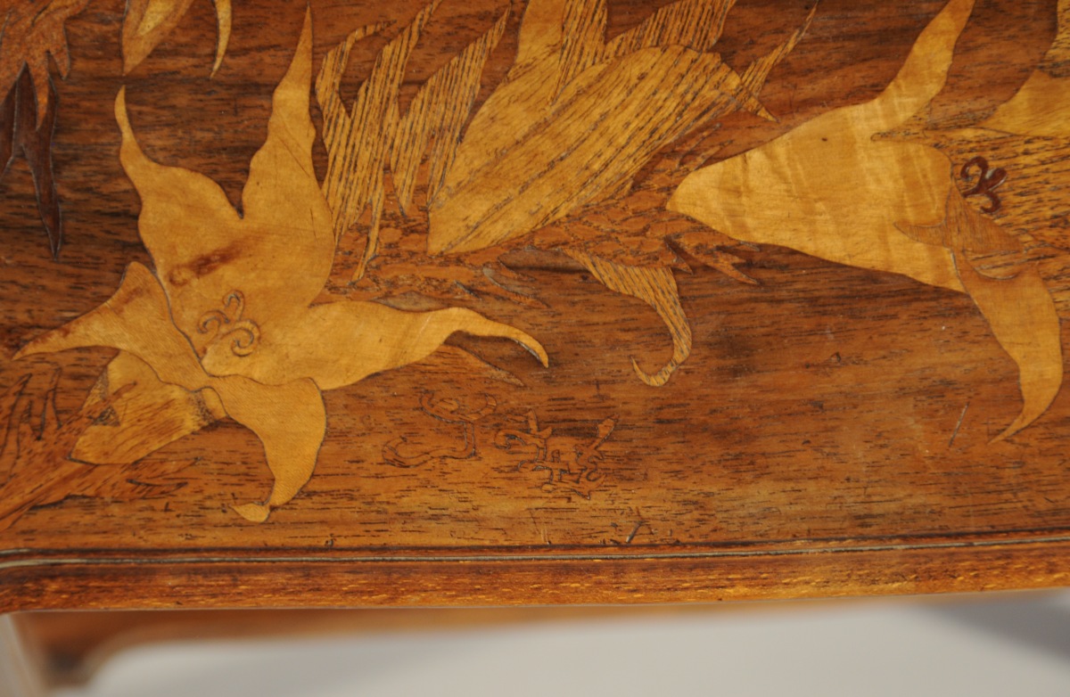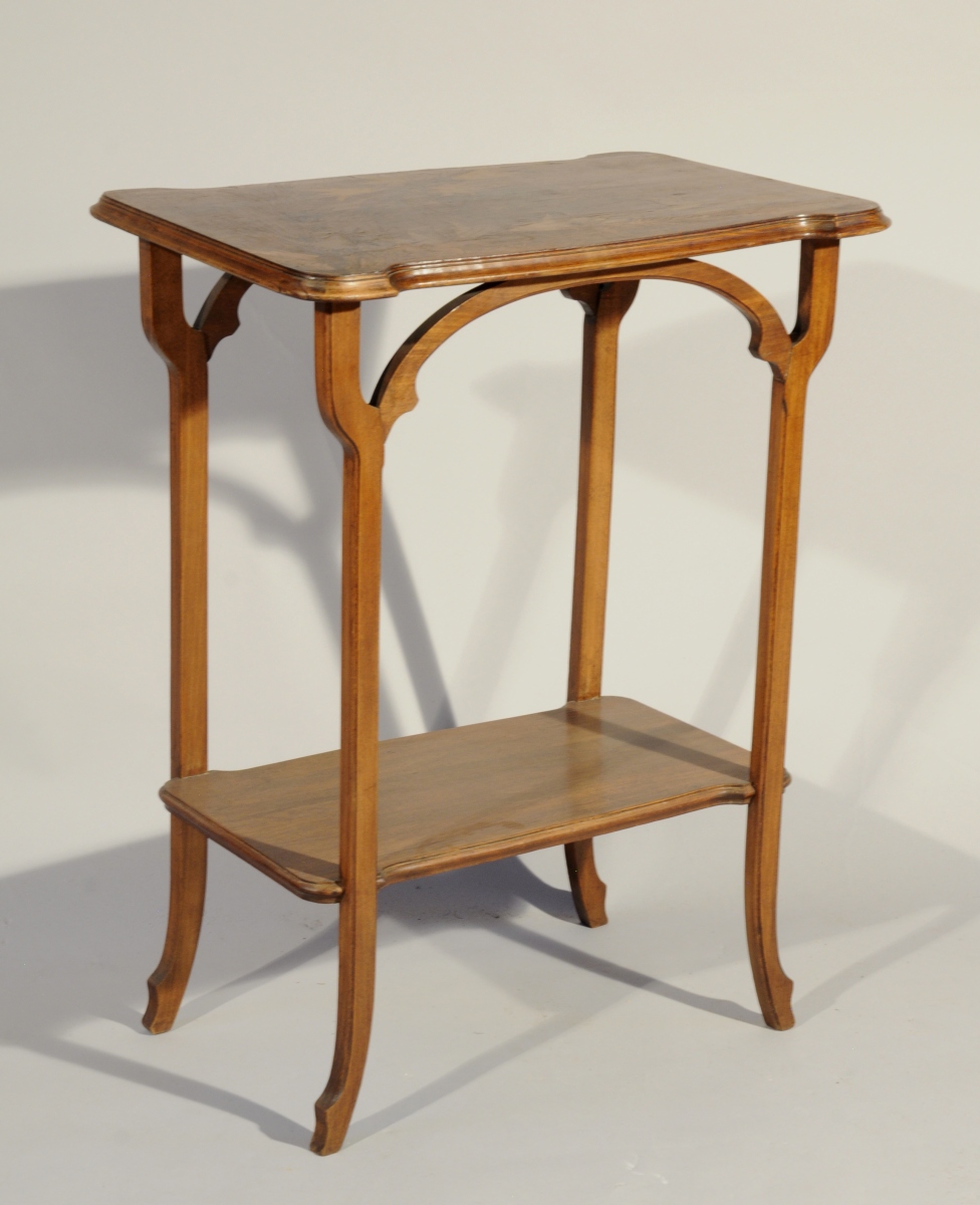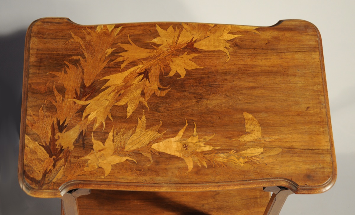 Décor marqueté de flore lorraine et papillons se déployant depuis l'angle inférieur gauche sur le plateau supérieur. Pieds légèrement galbés se scindant en deux pour former un arc en plein cintre soutenant le plateau supérieur.