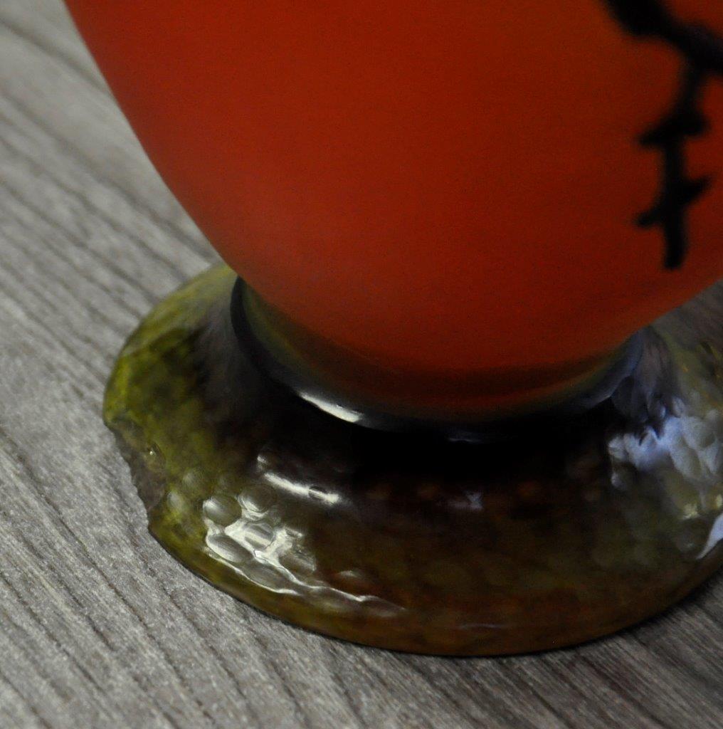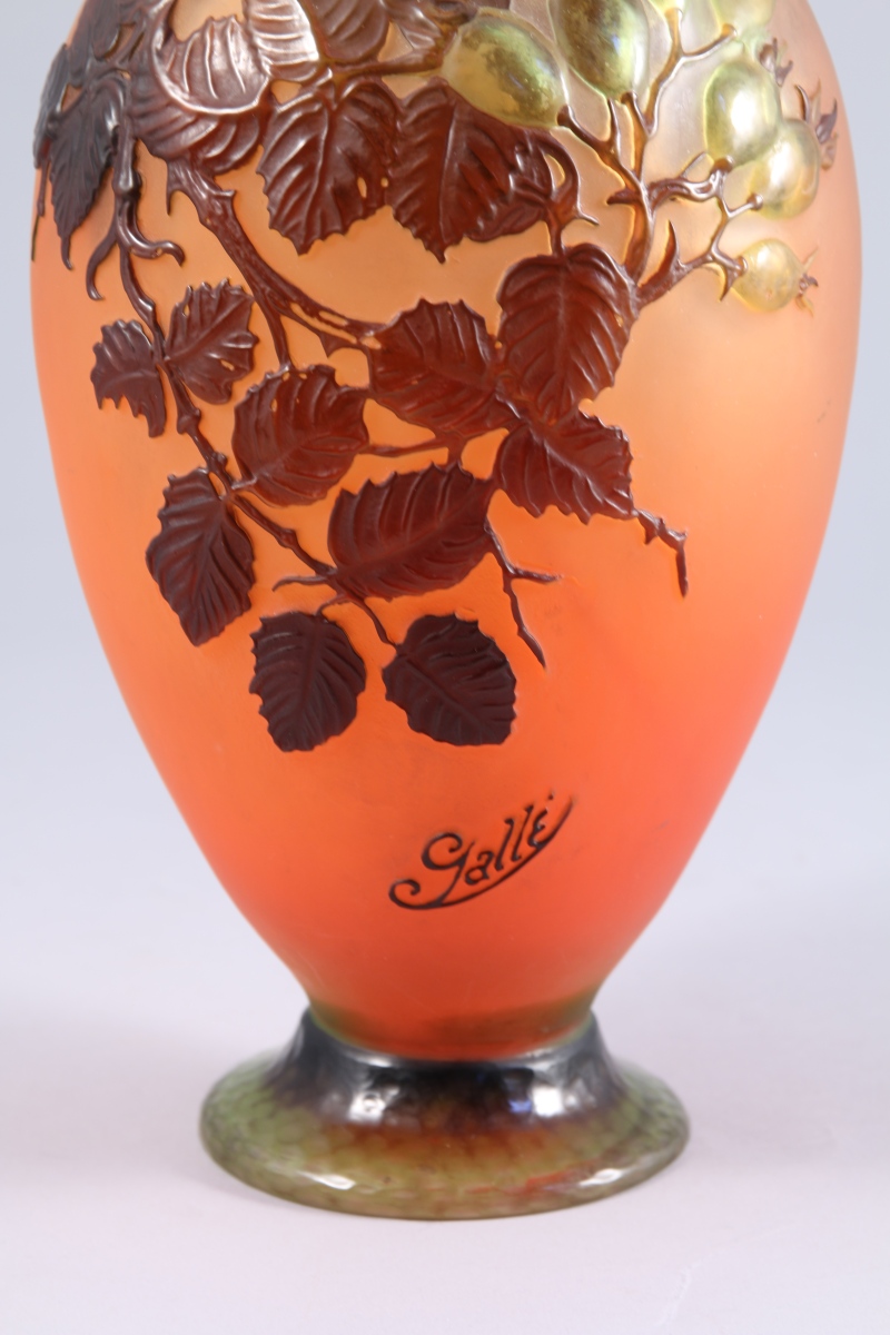 GALLÉ. VASE balustre en verre pressé et moulé à décor de fruits d'églantier de couleur jaune et prune sur un fond orangé.