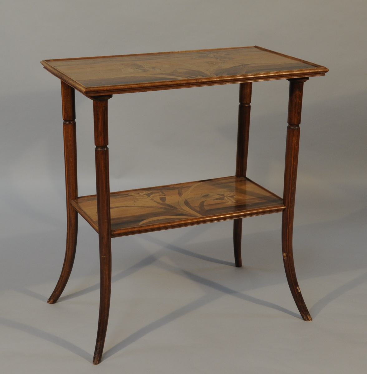 Émile GALLÉ (1846- 1904). TABLE À THÉ à deux plateaux en bois naturel marqueté d'iris. Elle repose sur quatre pieds cambrés.