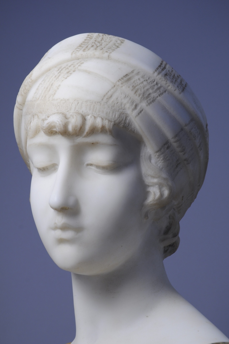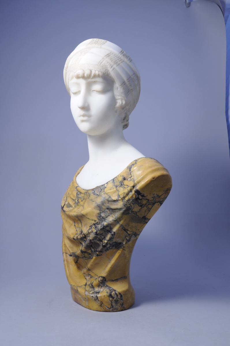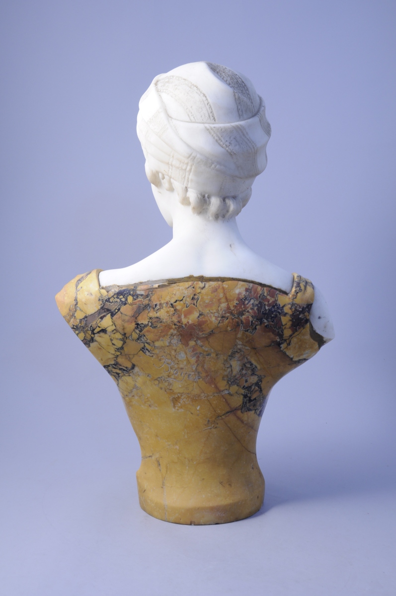 BUSTE de FEMME en marbre blanc, sa tunique en marbre jaune de Sienne coiffée d'un turban.
