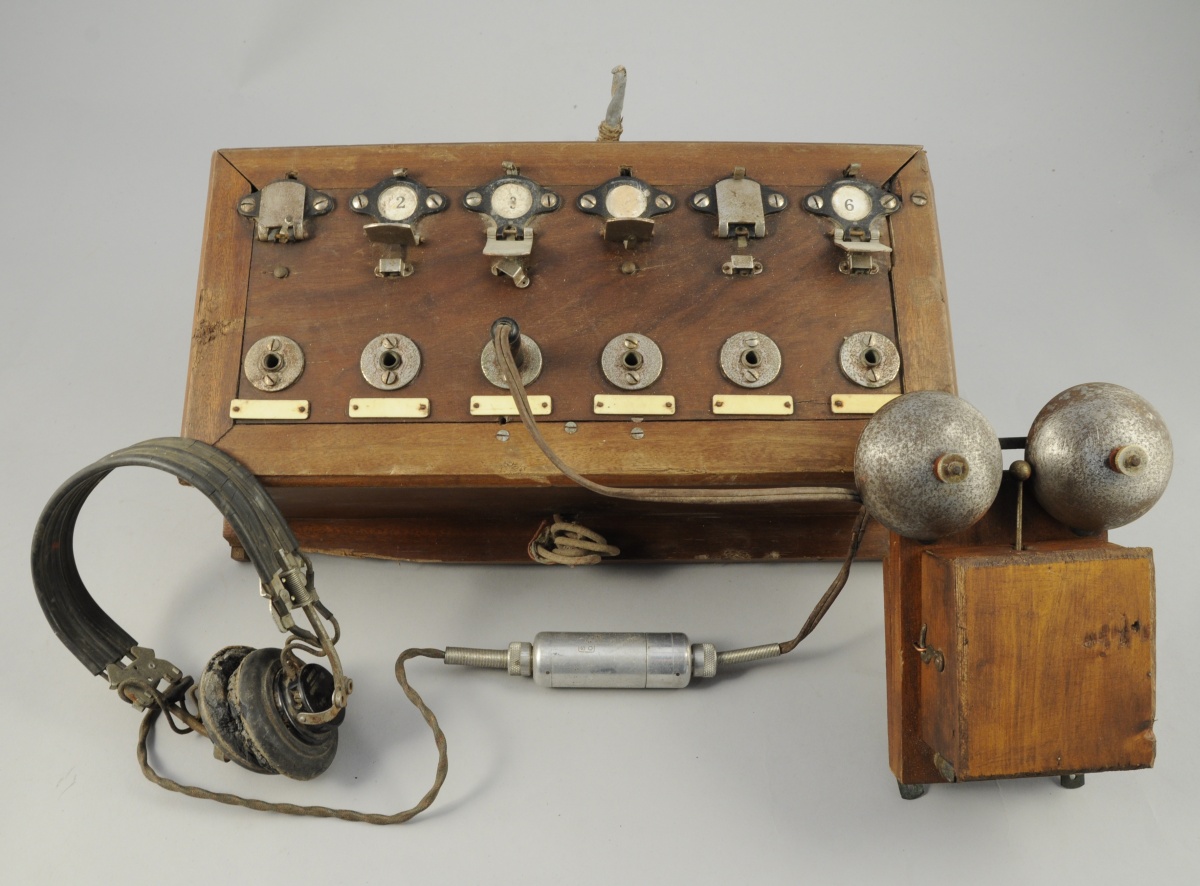 STANDARD téléphonique à six entrées. Caisse en bois, sonnerie deux tons et casque récepteur marqué "Western Electric / AN6-HI / D 173120".