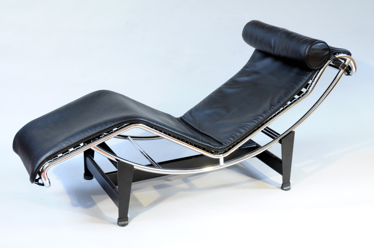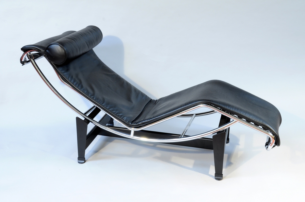 CHAISE LONGUE modèle "LC4" en métal tubulaire nickelé, revêtement de cuir noir composé d'un matelas et d'un coussin noir.
