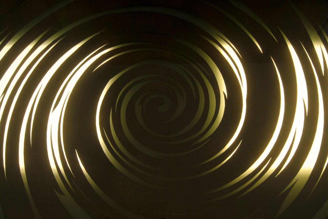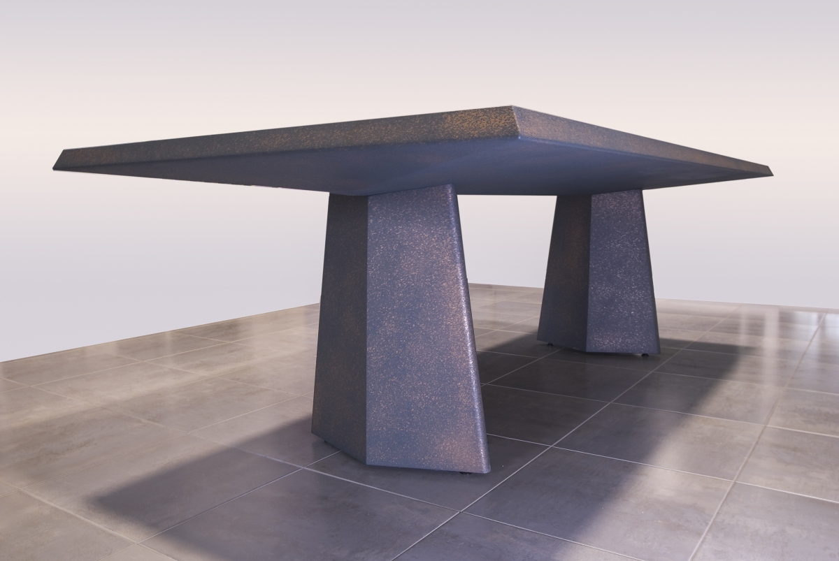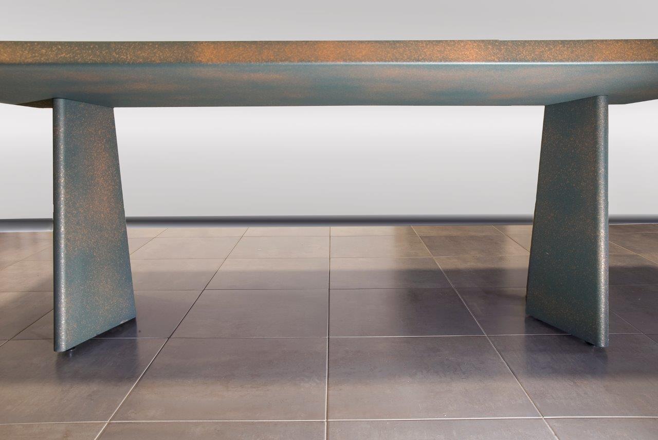 TABLE "VENDÔME" en acier epoxy rouille, le plateau de forme rectangulaire à découpe métallique en spirale lumineuse (Led) protégé par un plateau de verre sécurite. Bords repliés. La table repose sur deux pieds en losange.