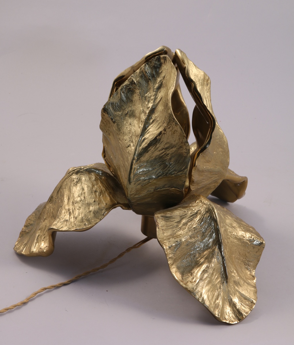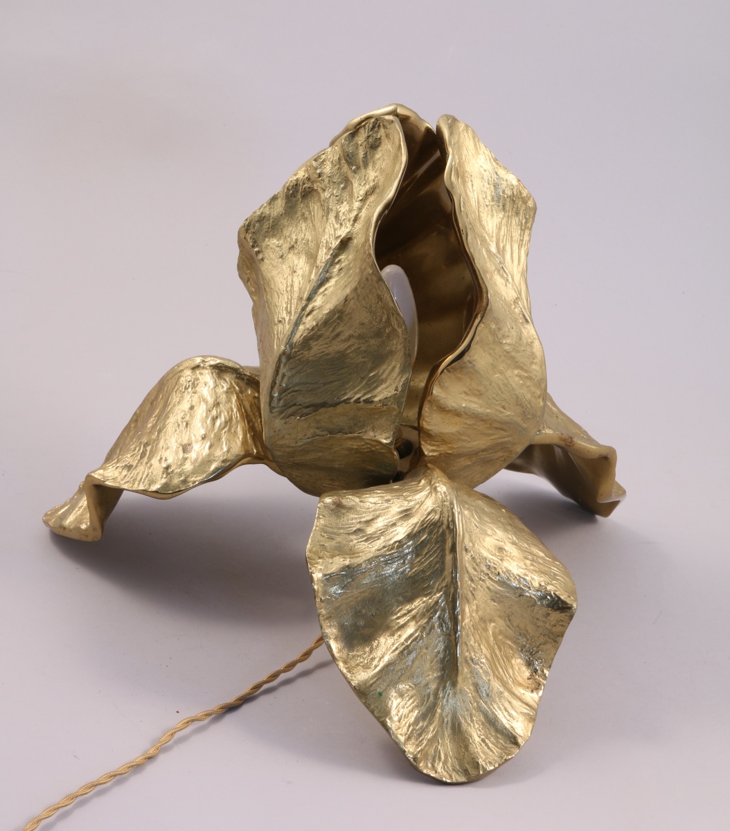 LAMPE en bronze doré figurant une fleur d'iris. Elle repose sur les trois pétale inférieurs.