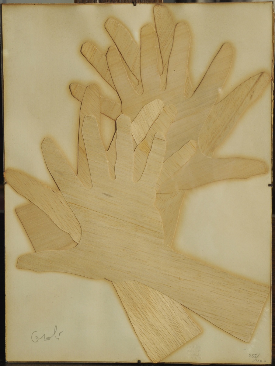 "Fellini - Satyricon". Bois découpé, signé en bas à gauche et justifié 255/400 en bas à droite. Cachet à sec sur le papier "La Biennale di Venezia 1969".