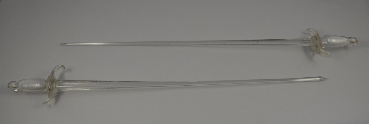 Deux ÉPÉES en verre étiré et soufflé. Lame quadrangulaire, garde mouvementée.