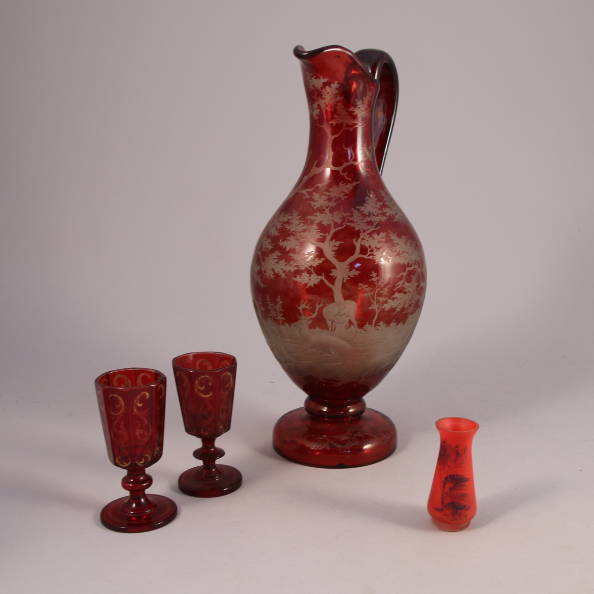 - AIGUIÈRE de forme balustre reposant sur un piédouche en cristal bicouche, rouge et translucide. Il reçoit un fin et riche décor gravé de cerfs et biche dans un sous-bois. Travail allemandou austro-hongrois, fin XIXe. Haut. 31 cm.
