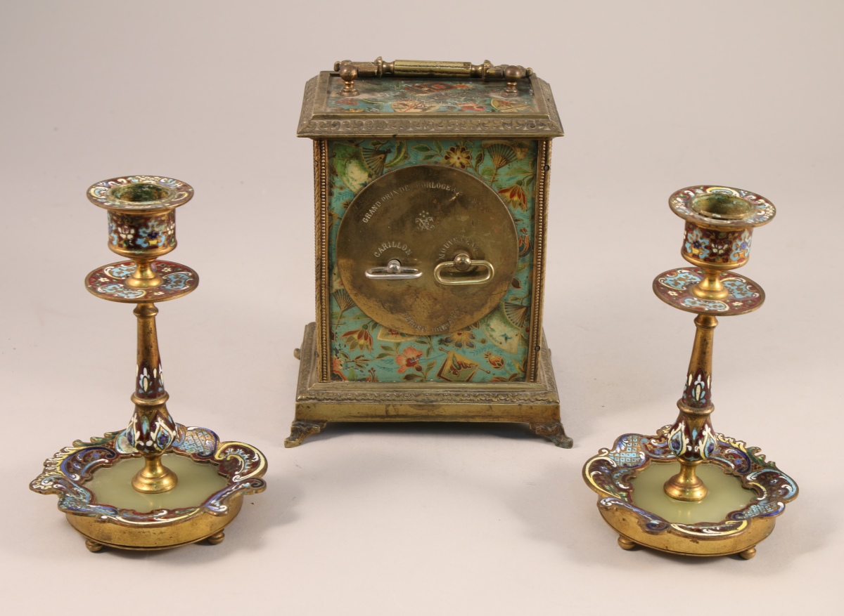 - Paire de FLAMBEAUX en bronze doré et émail cloisonné polychromme à décor végétal stylisé. Base chantournée foncée d'une plaque d'onyx.