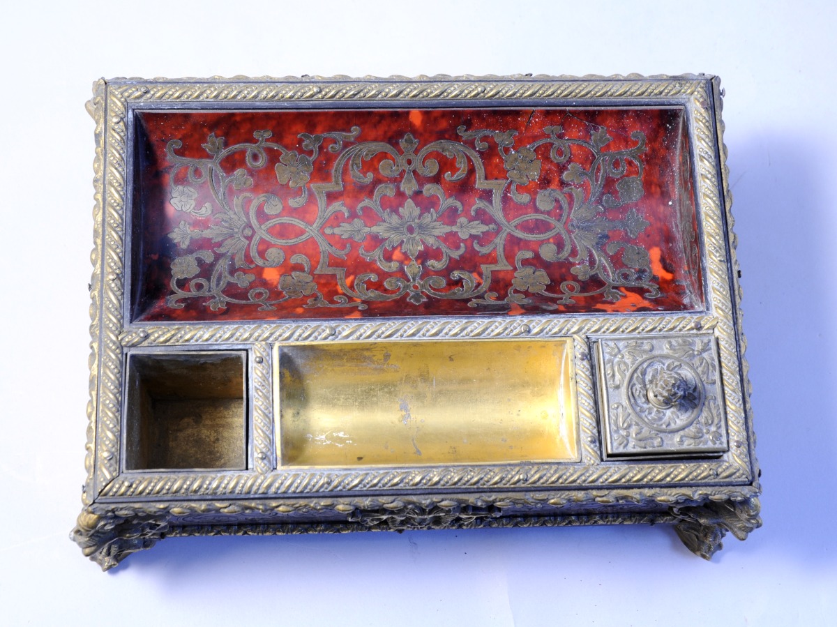 ÉCRITOIRE de bureau en marqueterie, dite Boulle, en première partie sur fond d'écaille rouge à décor d'enroulements floraux et arabesques en laiton.