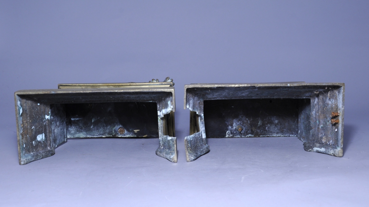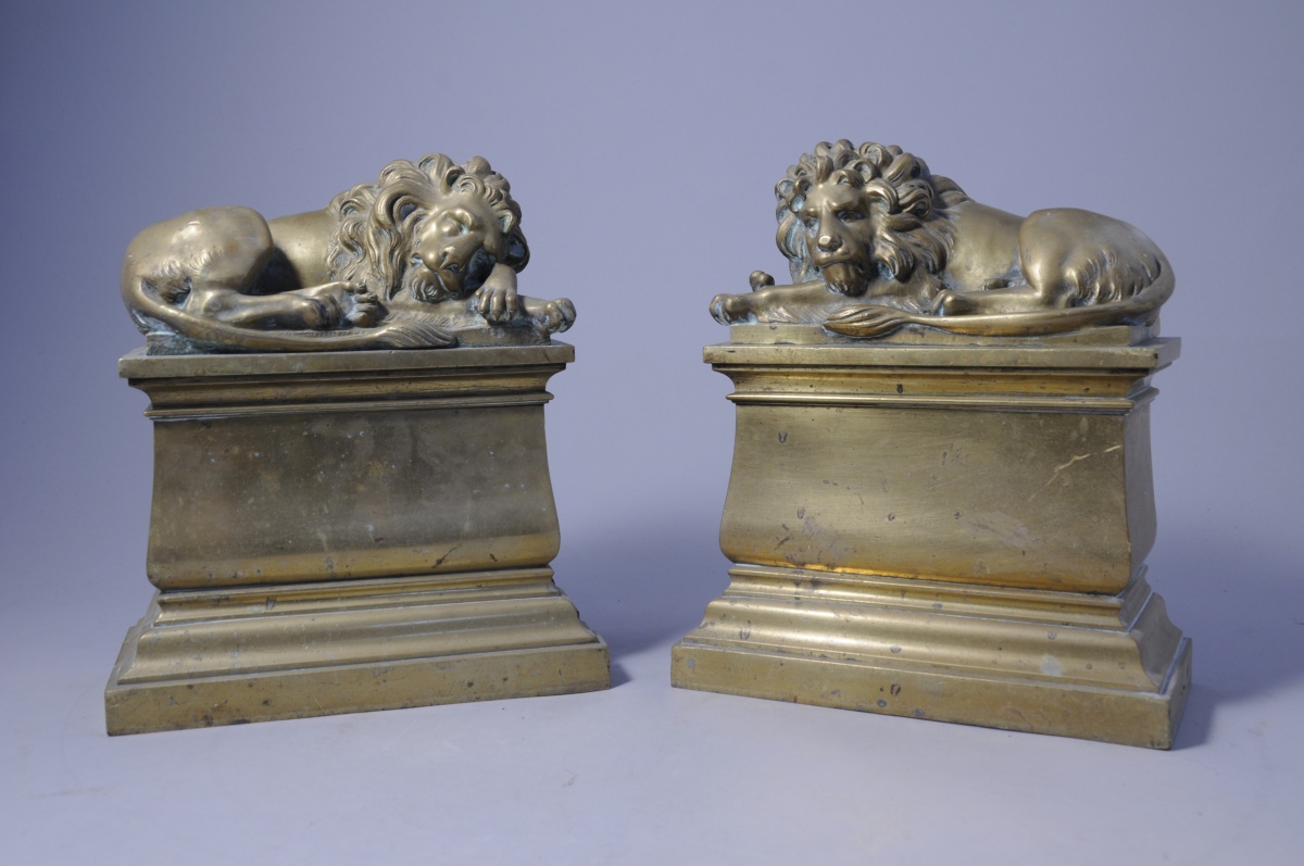 PAIRE DE FEUX en bronze ciselé et doré figurant deux lions endormis sur un socle à doucine.