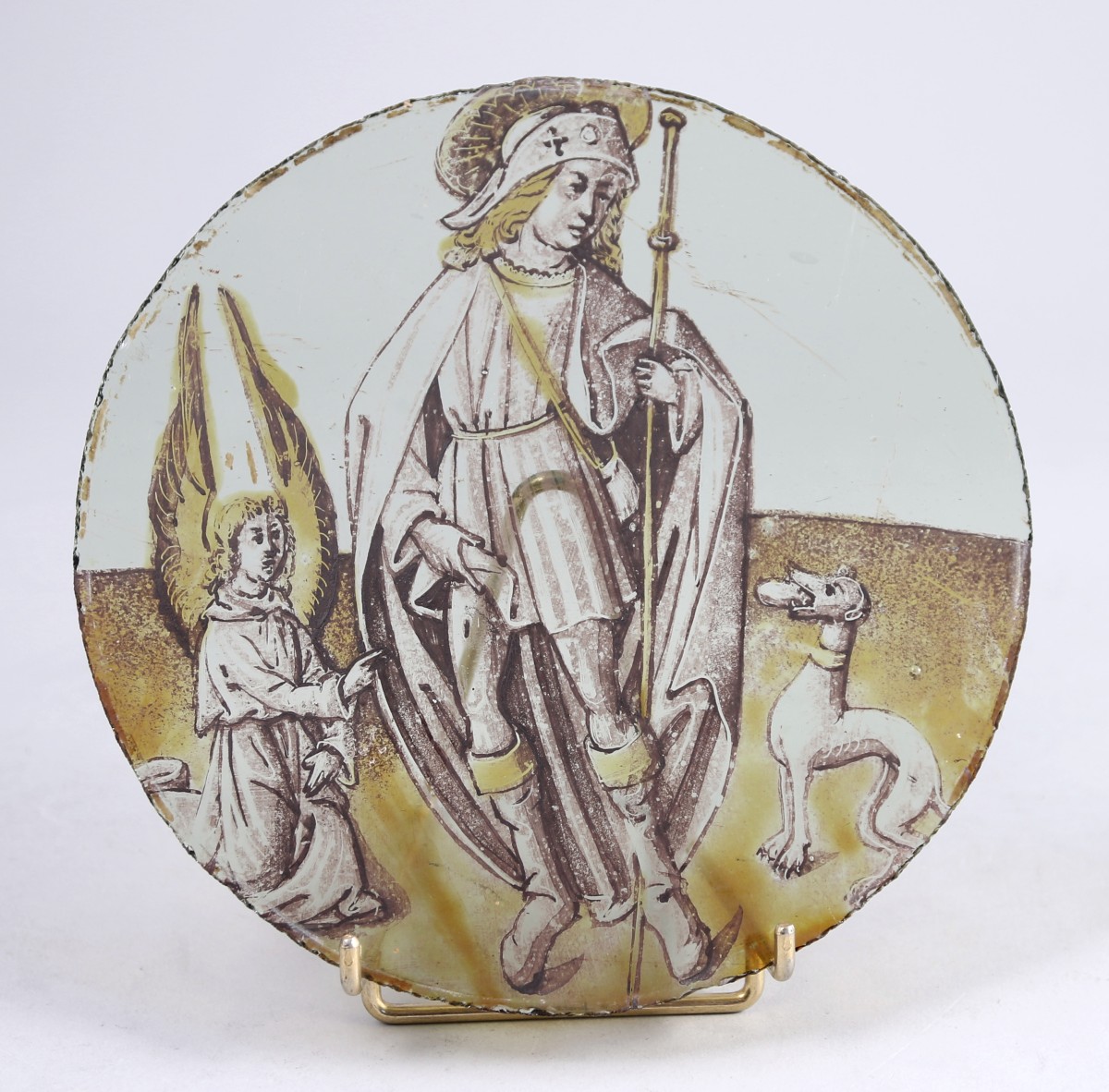 Saint ROCH. Vitrail à jaune d'argent, en forme de tondo. Il figure saint Roch, un chien à sa droite, un ange à sa gauche.