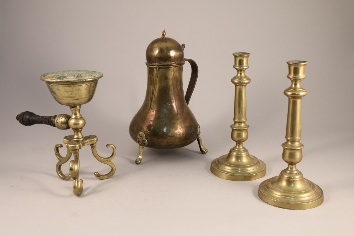 - CAFETIÈRE balustre à large panse basse. Couvercle hémisphérique sommé d'un fretel toupie en cuivre. Anse en fer forgé.Piètement tripode à attaches cloutées de cuivre. XVIIIe. Haut. 30 cm.