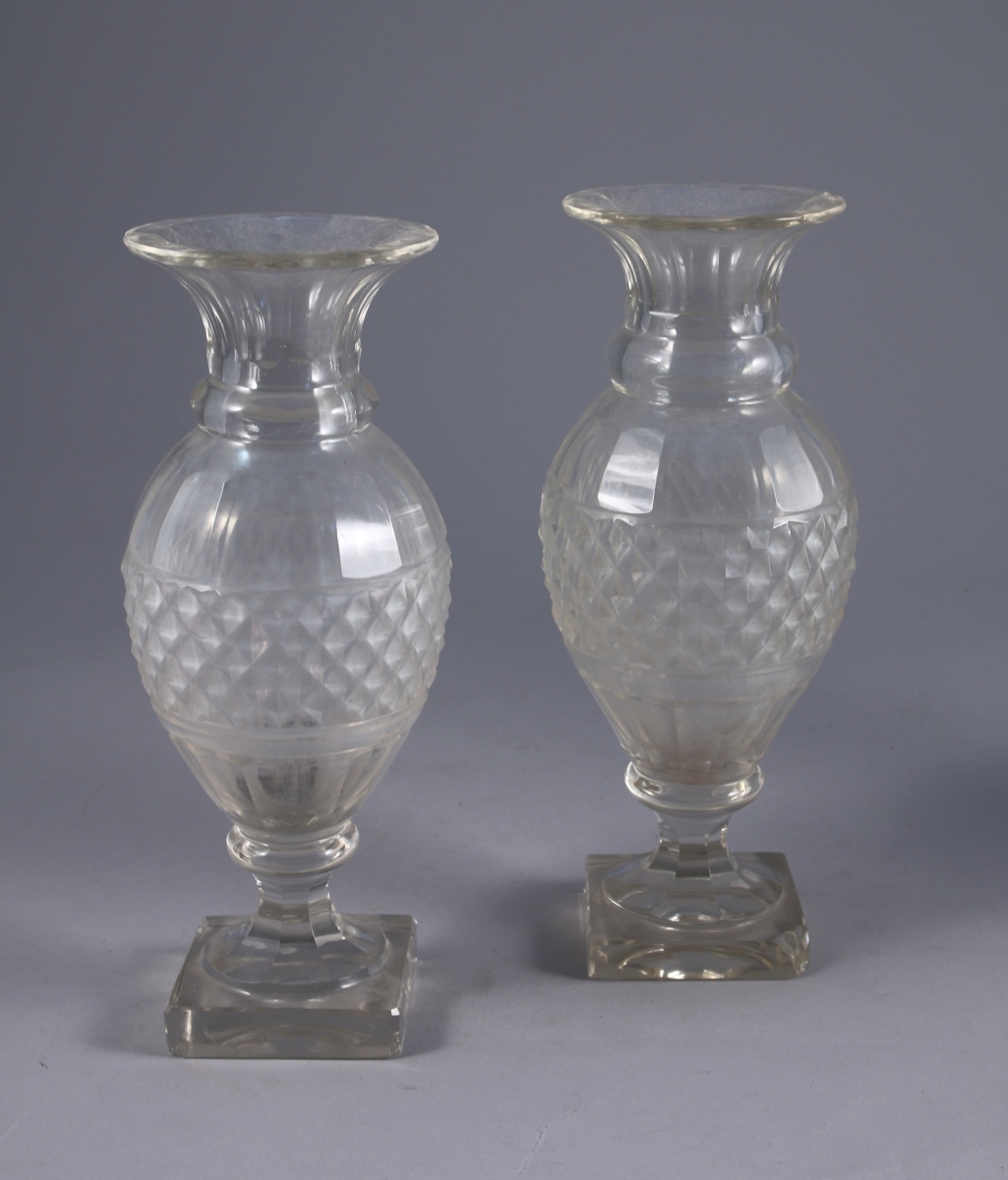 - DEUX VASES formant paire à panse ovoïde et col évasé en cristal taillé. Décor de pointes de diamant et pans coupés. Ils reposent sur un piédouche à base carrée. XIXe.
