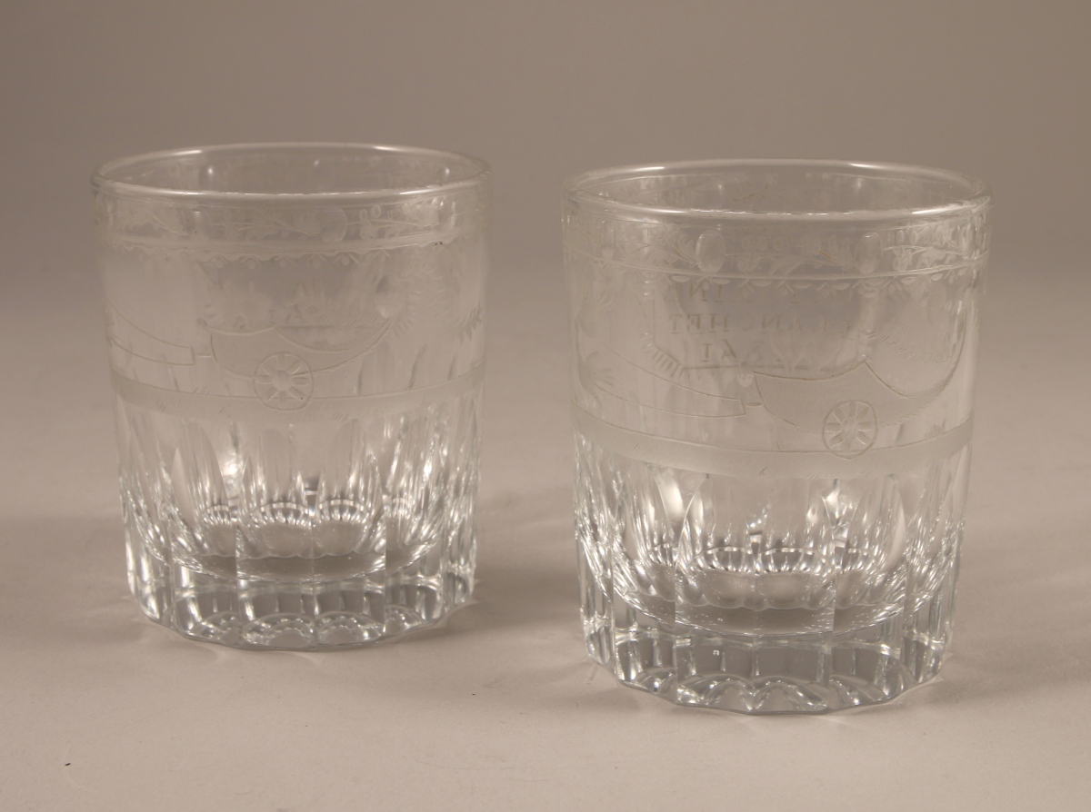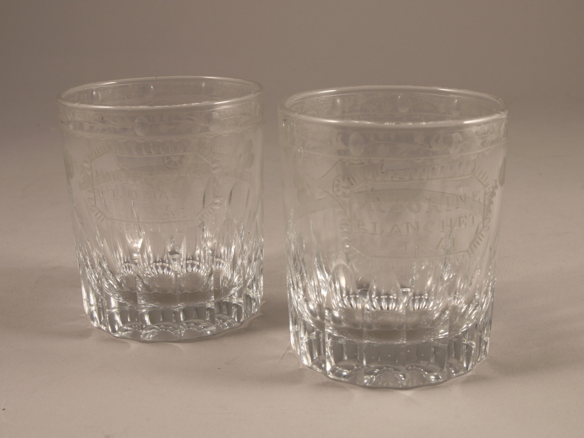 Paire de VERRES souvenir, en verre soufflé à côtes - et gravé à la main de fleurettes, char d'amour - avec cartouches gravé "Victorine Blanchet 1841" et "Marie Julie Flumas 1841".