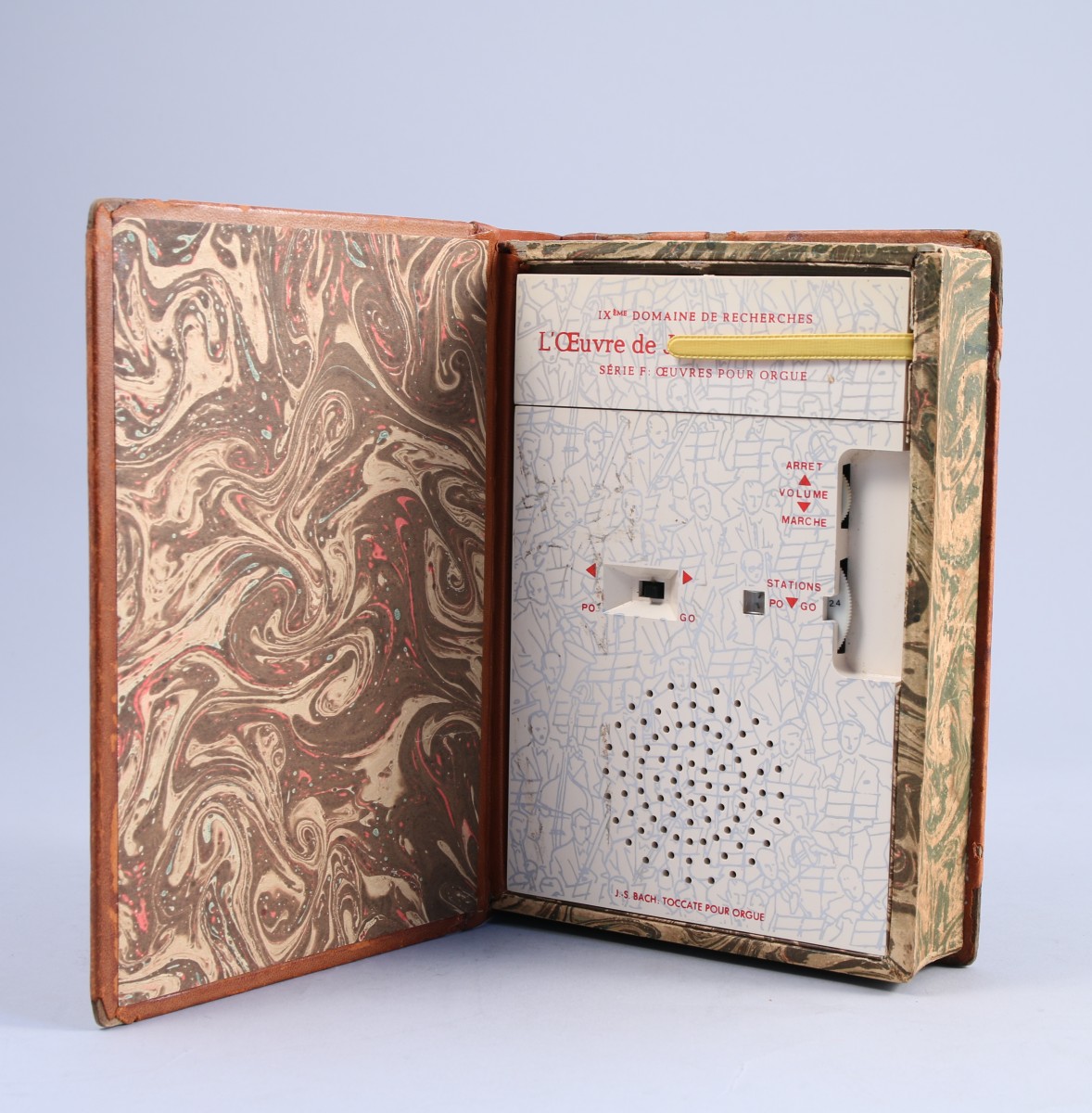 POSTE de RADIO présenté en reliure de livre, dans un coffret et son emboîtage.22,5 x 16 cm.
