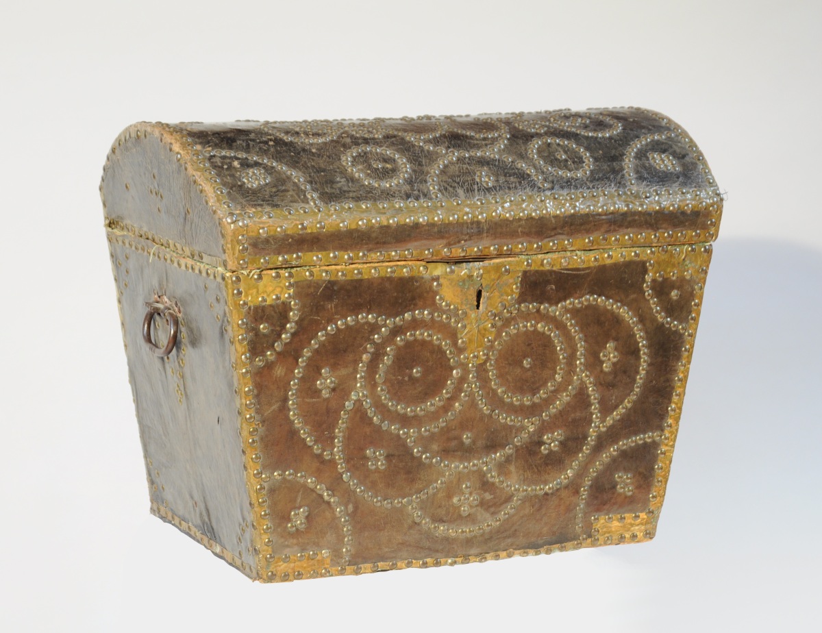 Petit COFFRE de VOYAGE de forme trapézoïdale à couvercle bombé gainé de cuir brun clouté de laiton à décor floral stylisé. Arêtes et coins renforcés de feuilles de laiton. Poignées latérales.