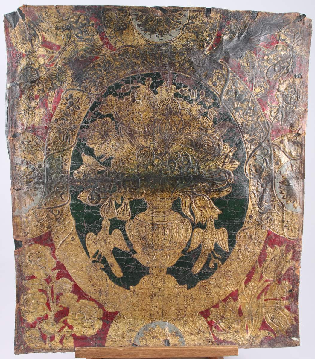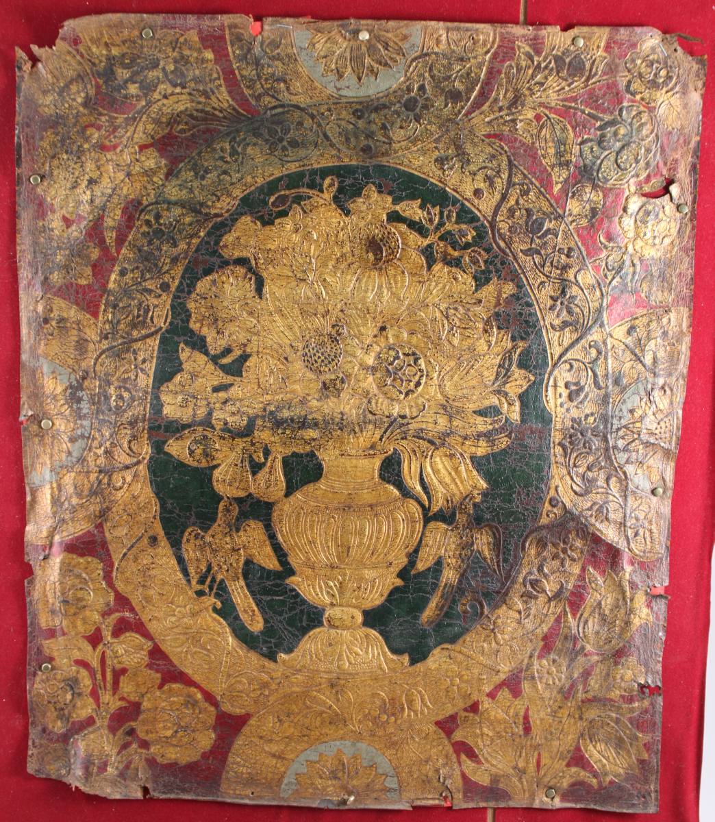 Deux PAIRES de panneaux en "CUIR DE CORDOUE" gaufré, polychrome et doré. Ils figurent, dans un médaillon central feuillagé, un large bouquets de fleurs dans un vase balustre godronné. Ce dernier flanqué de deux oiseaux.