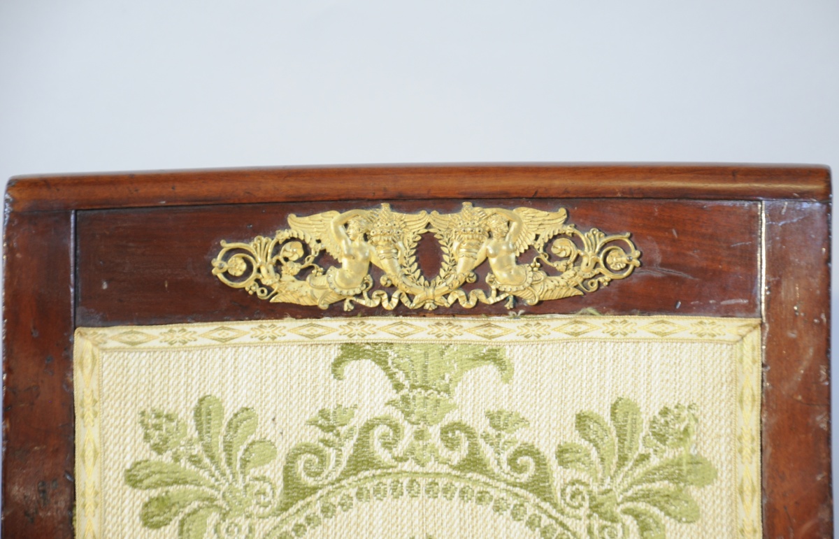 Ornementation rapportée de bronzes ciselés et dorés tels que sirènes phytomorphes enserrant une corne d'abondance sur la traverse haute du dossier, foudre en ceinture et griffes sur les pieds antérieurs.